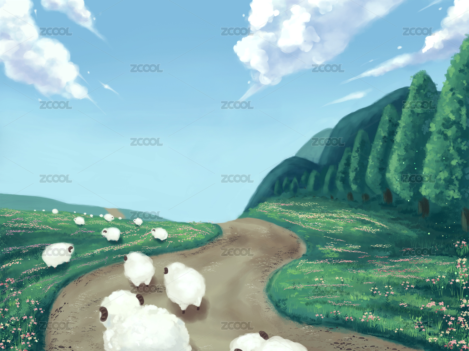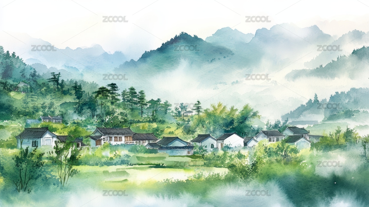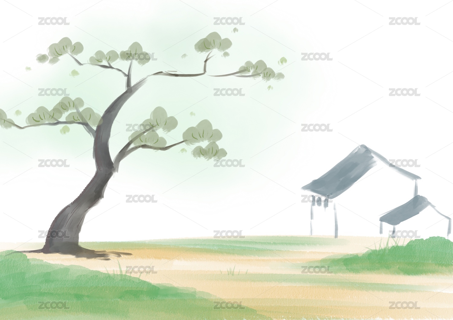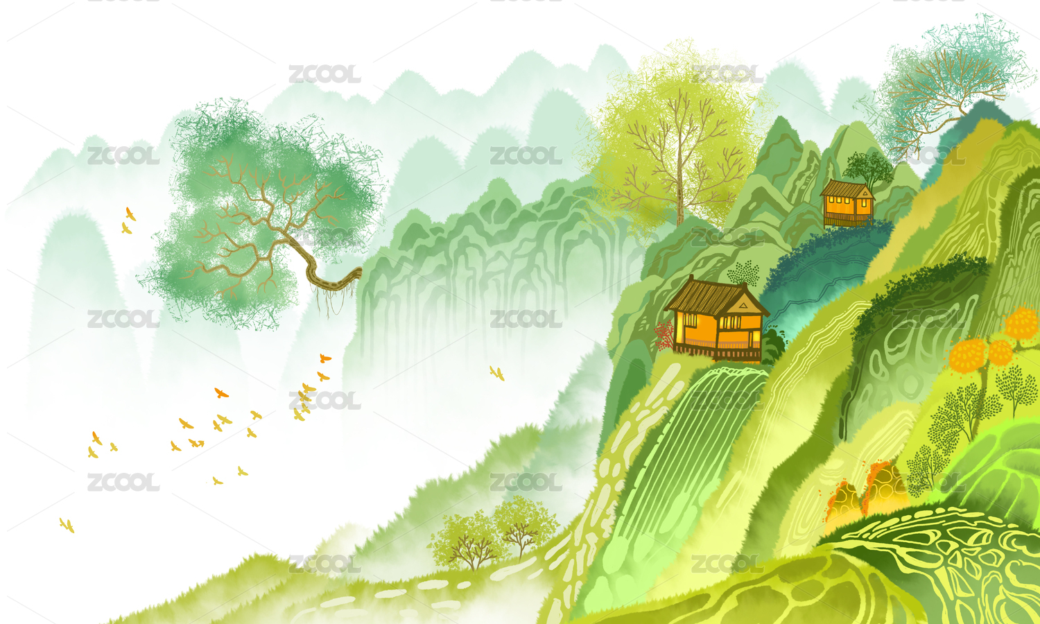 手繪田園風(fēng)光中國(guó)畫(huà)山水風(fēng)景畫(huà)