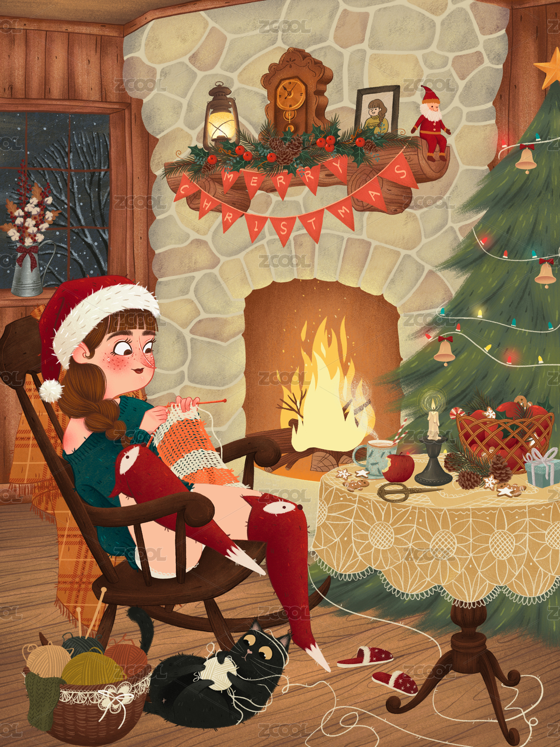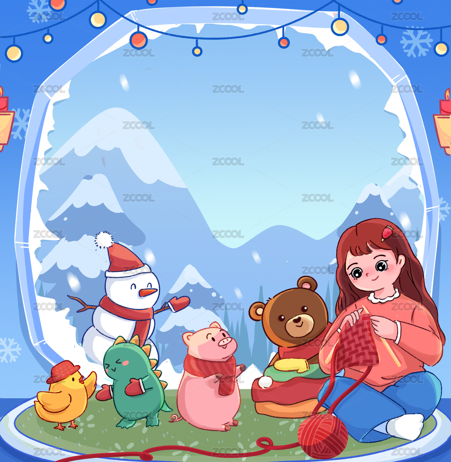 十二月圣誕節(jié)下雪女孩織毛衣手繪插畫(huà)海報(bào)