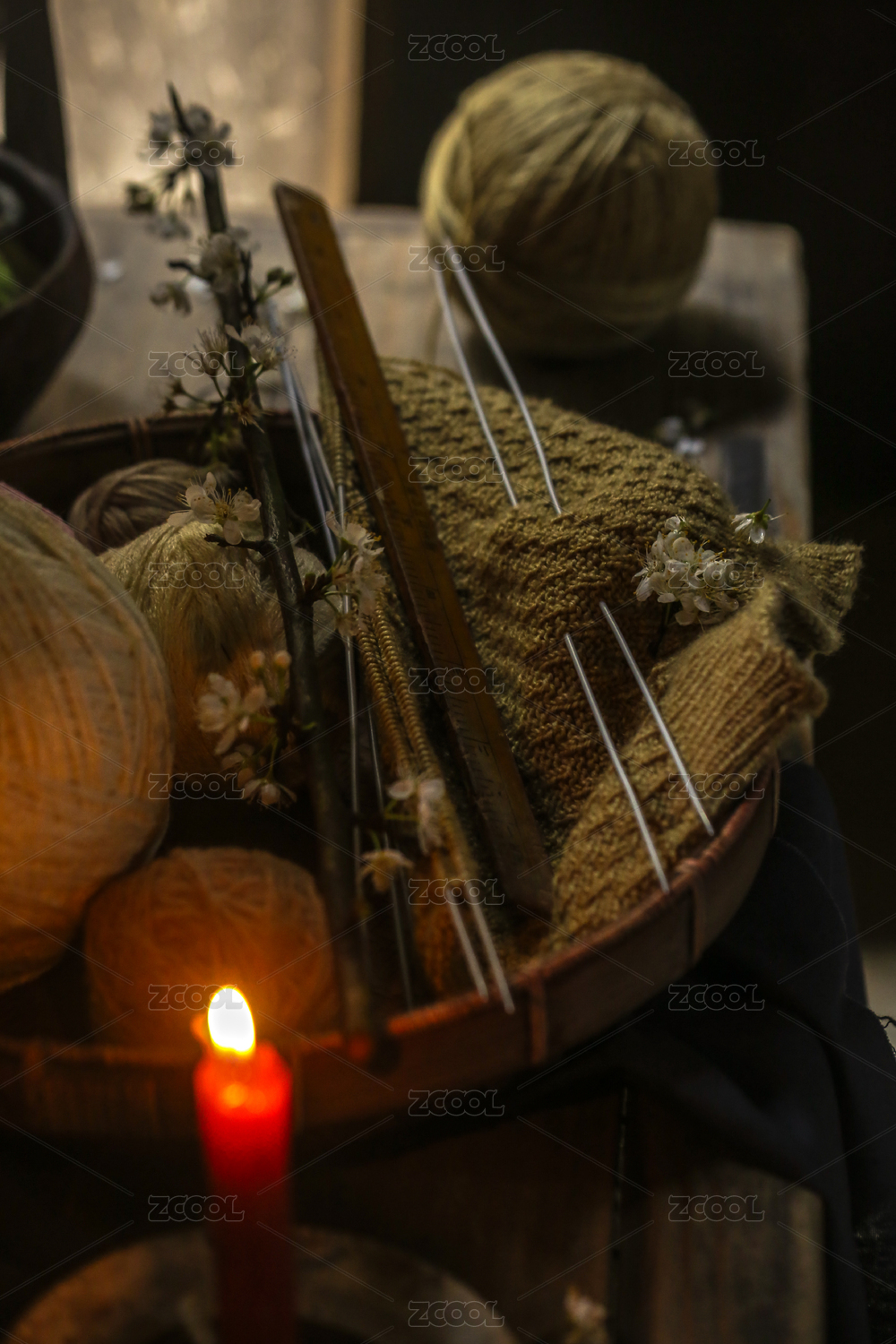 籃子里放著織到一半的毛衣和毛線球