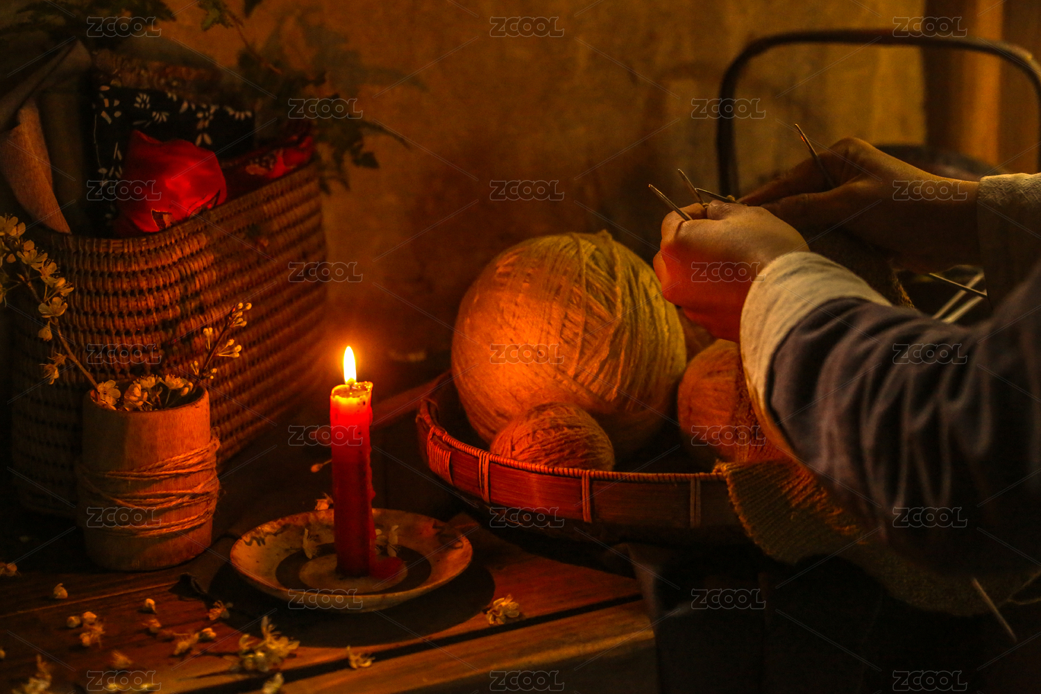 燭火旁邊正在織毛衣的動(dòng)作