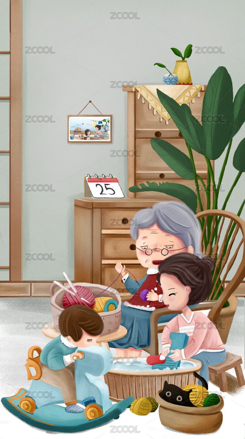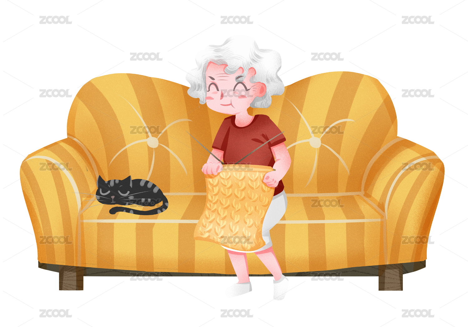 小清新風(fēng)格獨(dú)居老人在沙發(fā)上織毛衣插畫(huà)元素