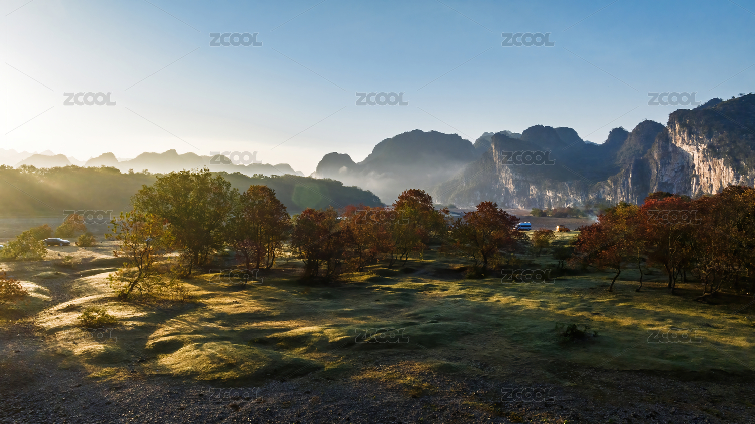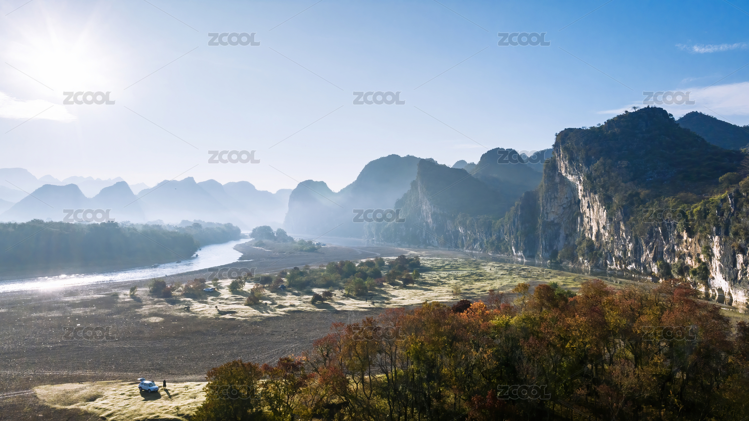 秋天陽光下桂林漓江河灘上烏桕樹林旁的汽車
