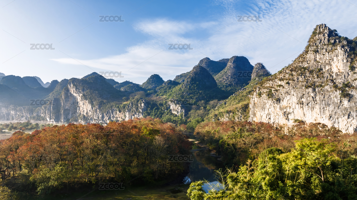秋天清晨陽光下桂林漓江河灘上的烏桕樹林