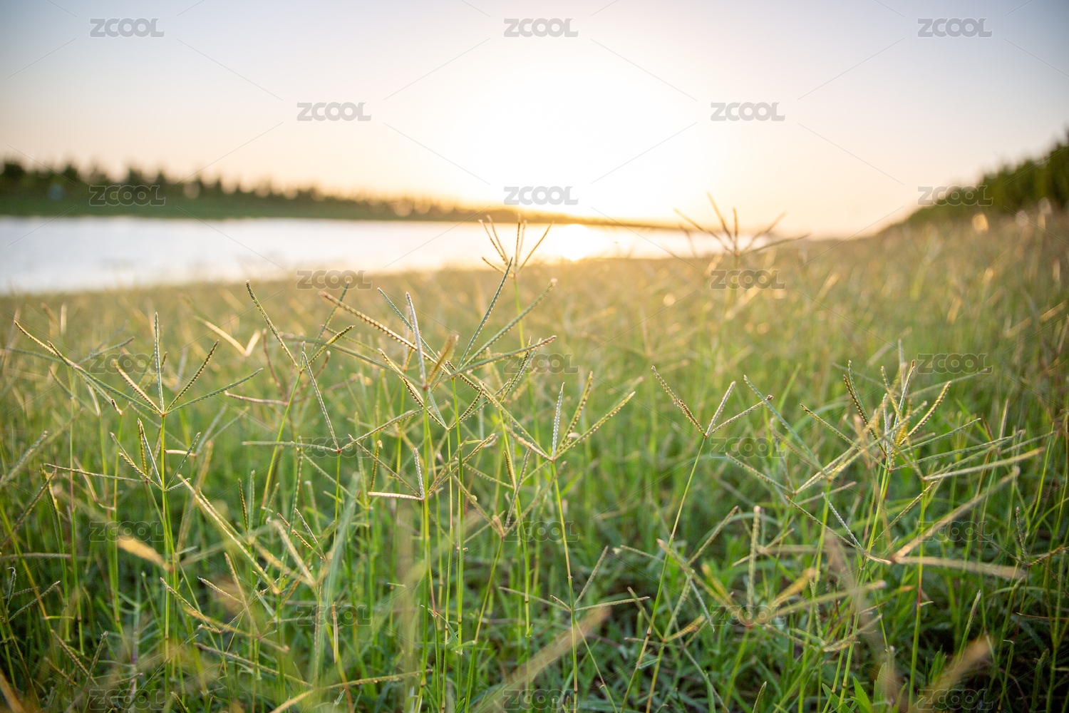 夏日河灘葉草遍布的夕陽景象