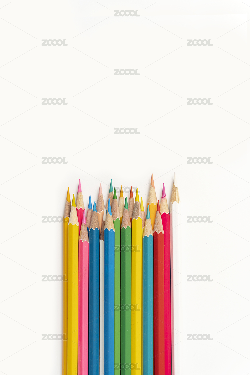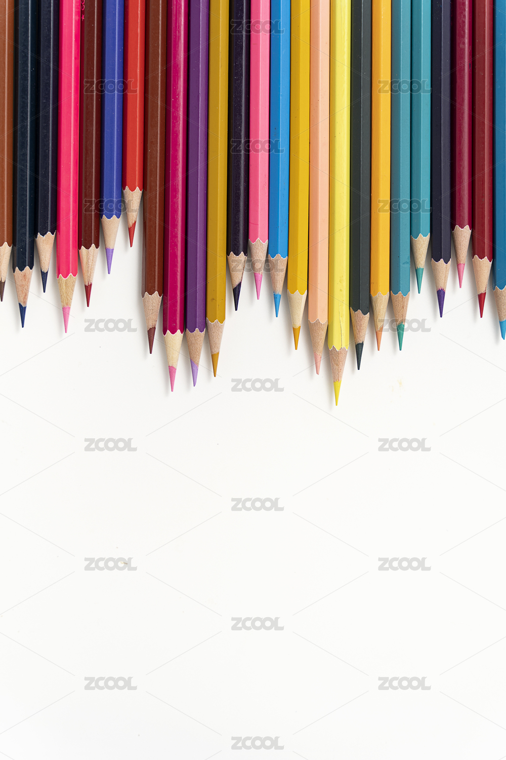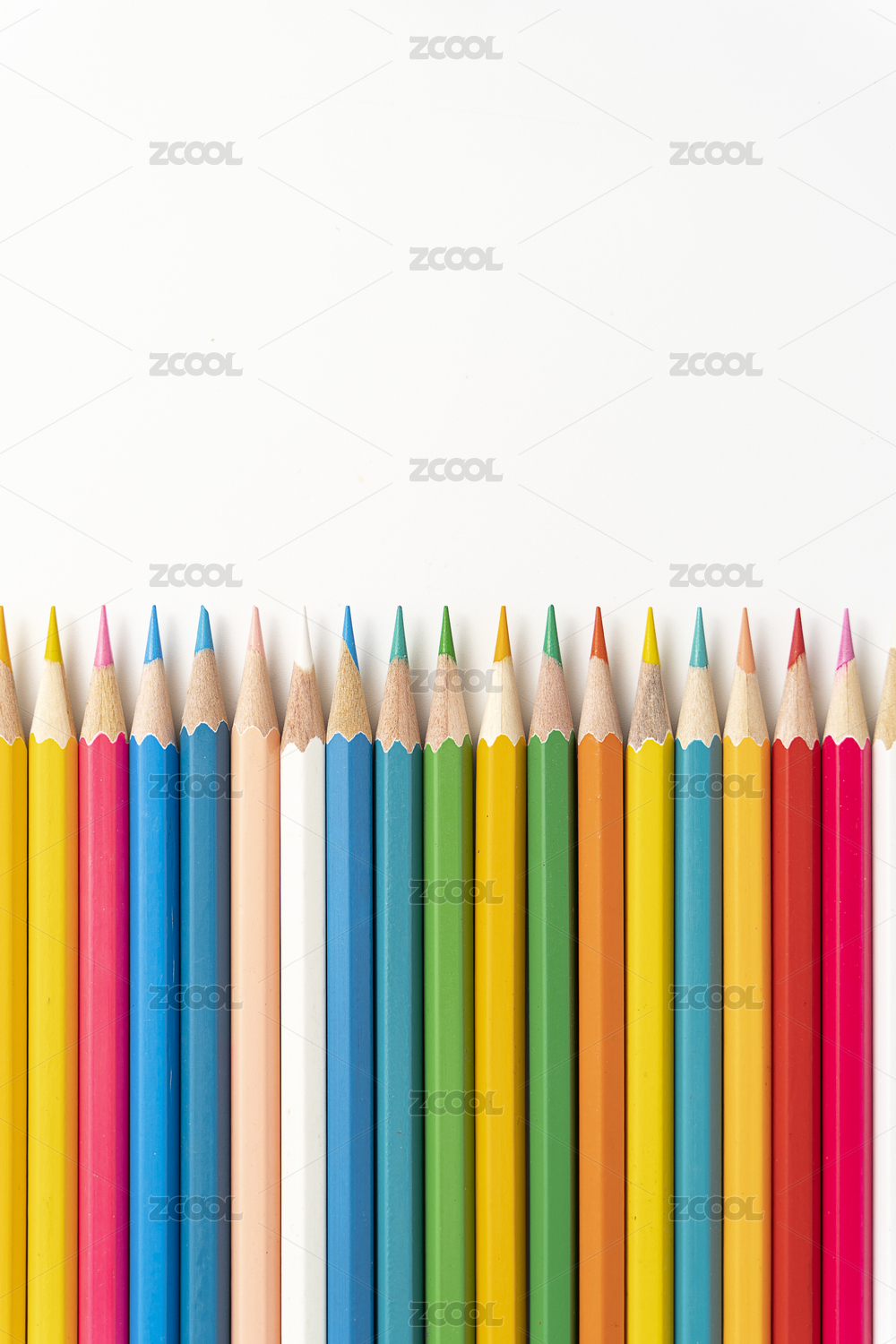 一排整齊的彩色鉛筆白色