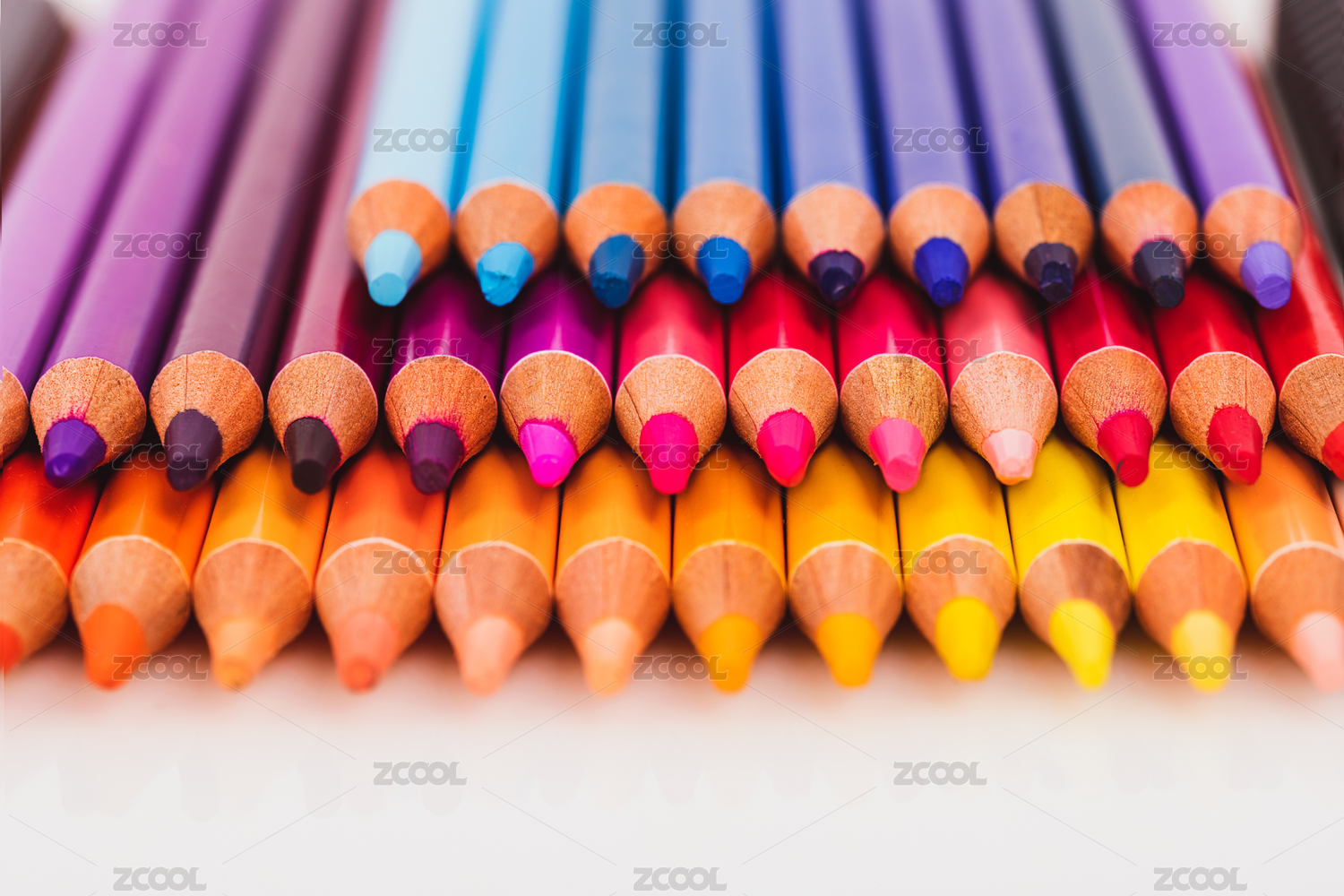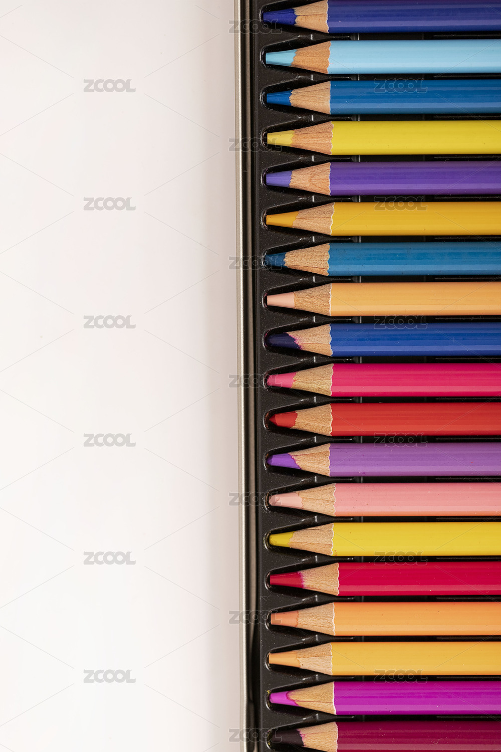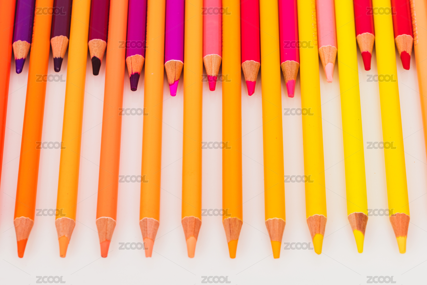 一排整齊的彩色鉛筆白色