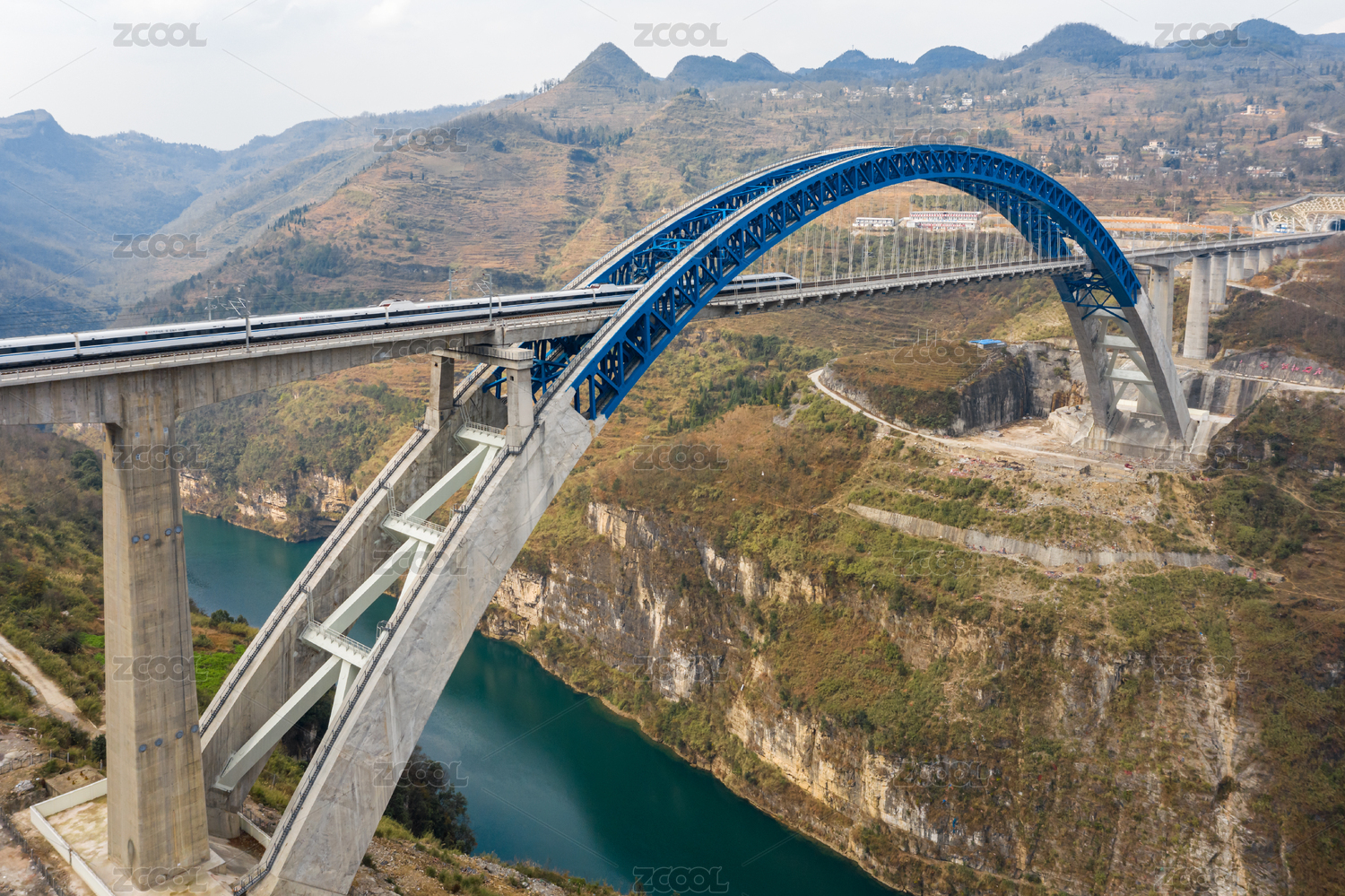 航拍高鐵駛過中國貴陽鴨池河大橋