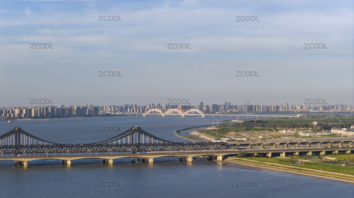 航拍高鐵駛過杭州錢塘江