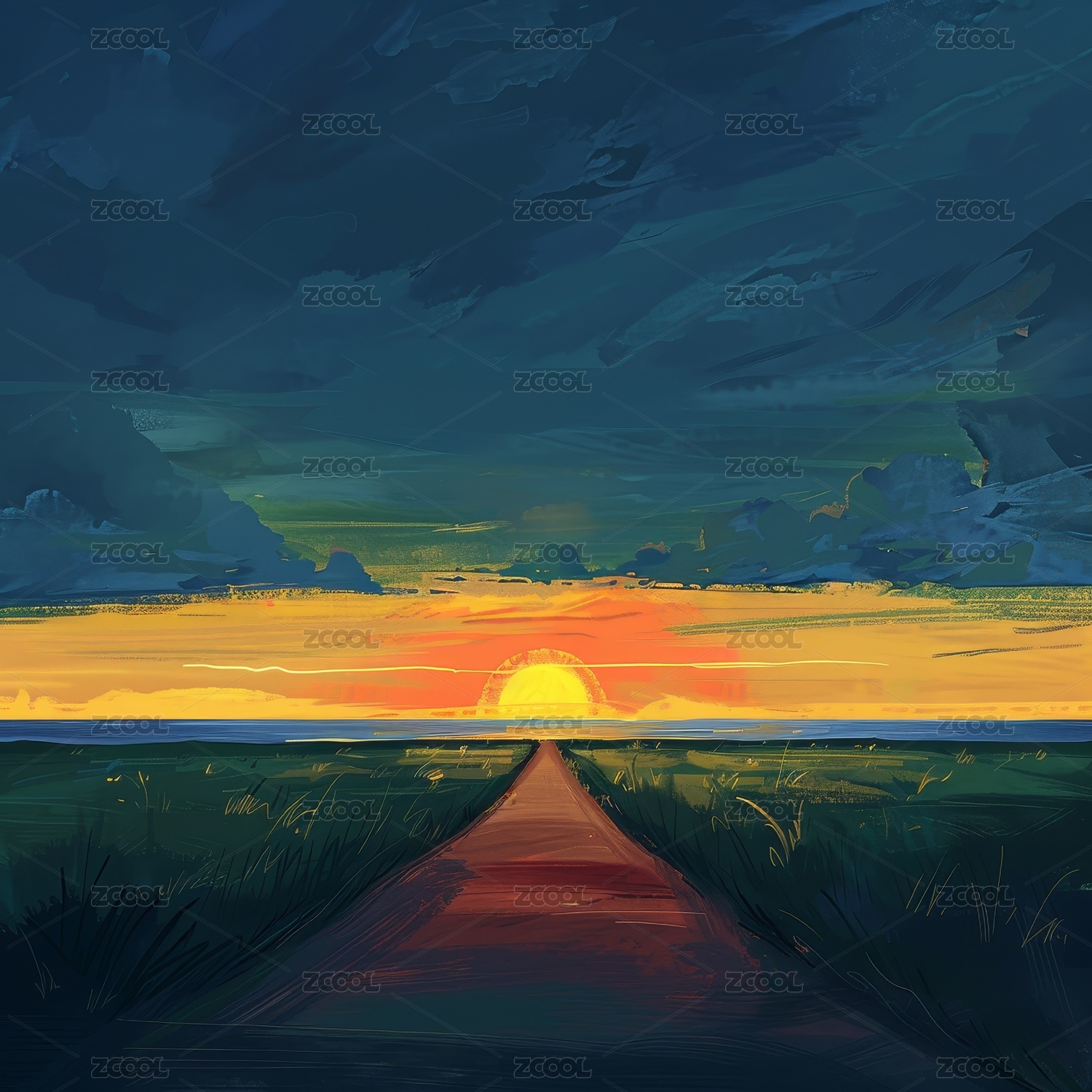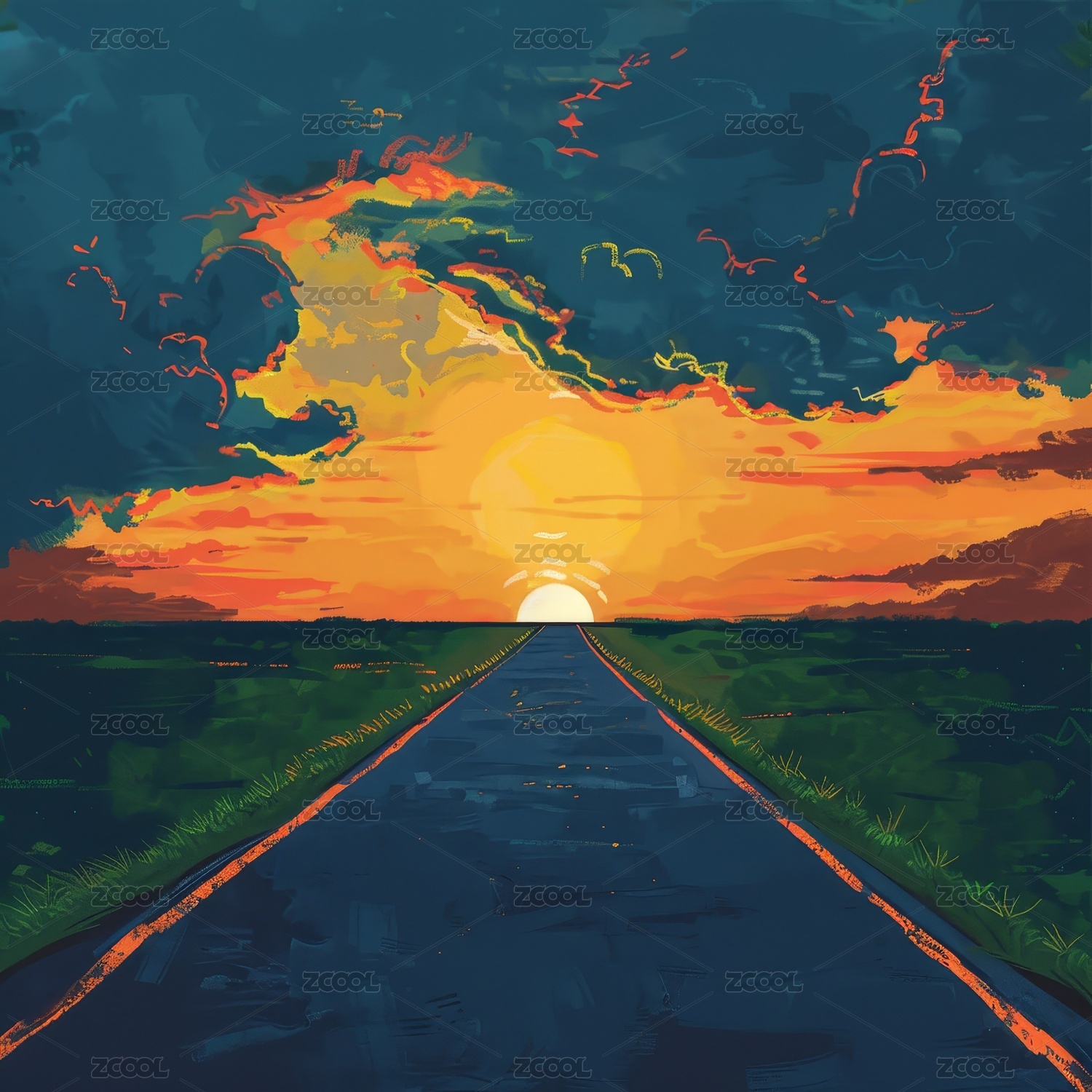 夕陽公路遠(yuǎn)景油畫風(fēng)景圖