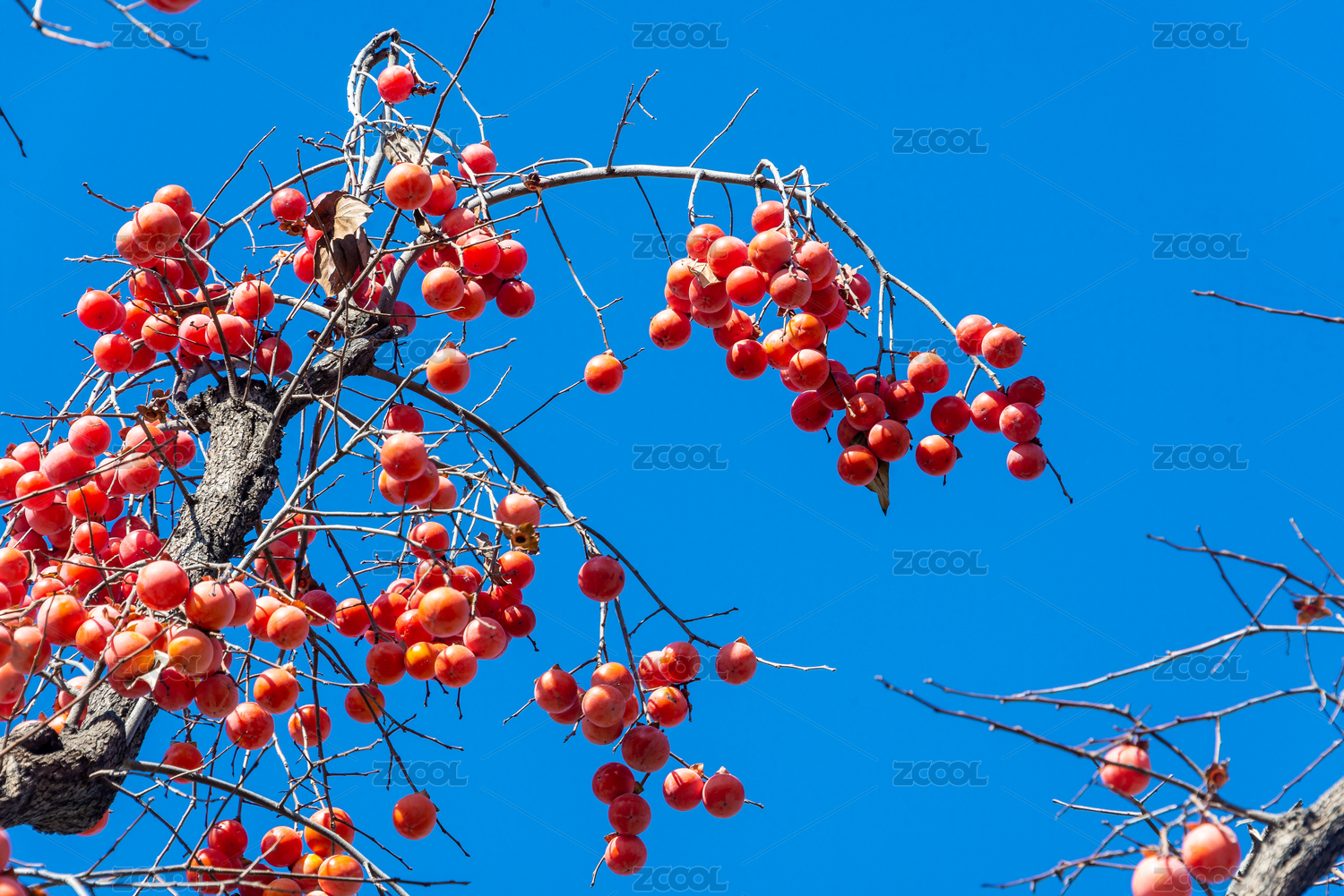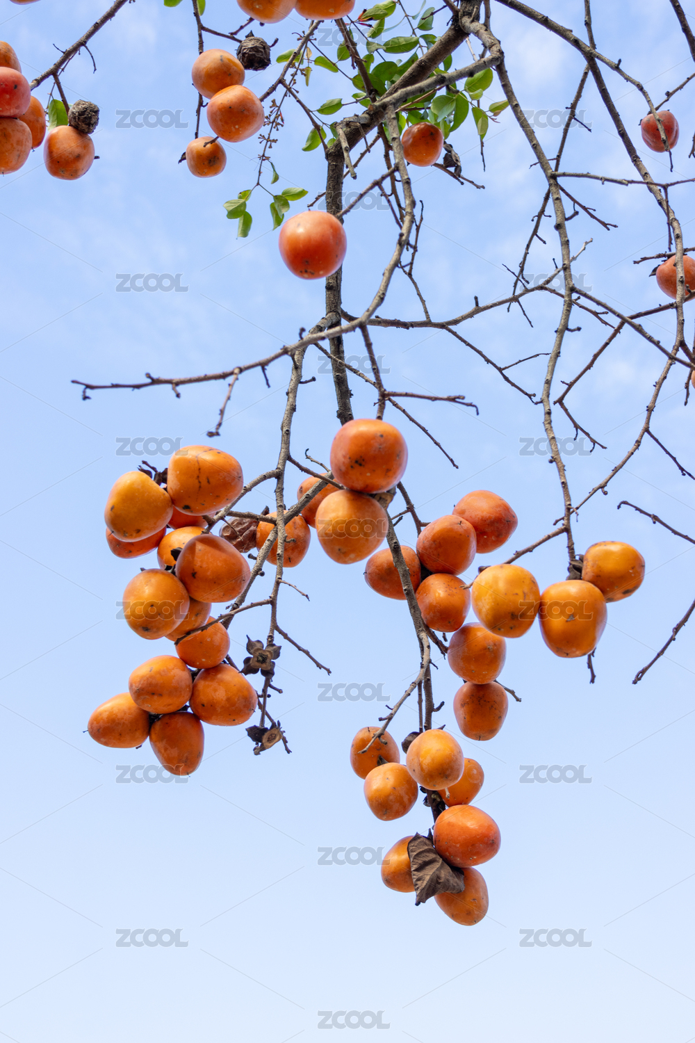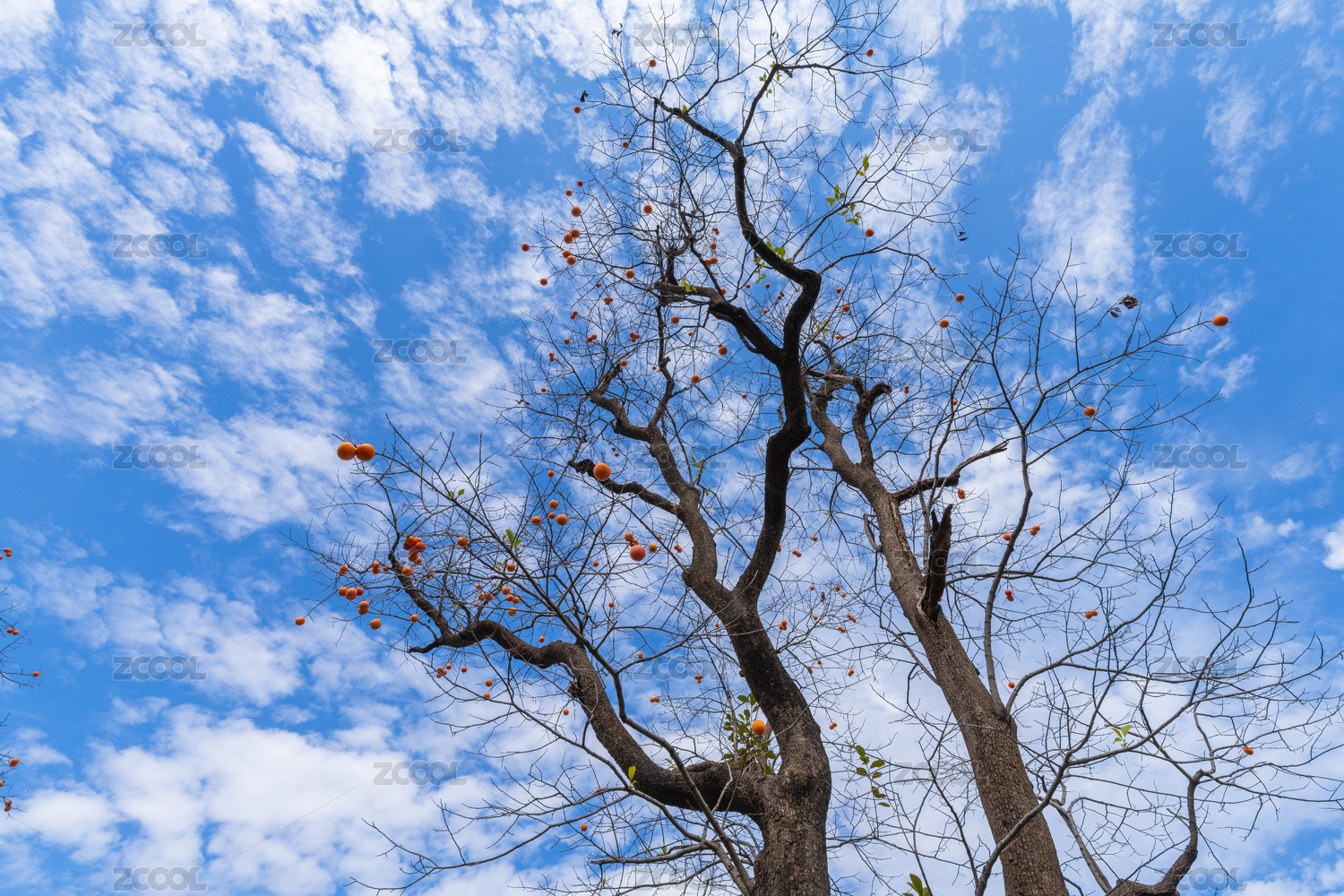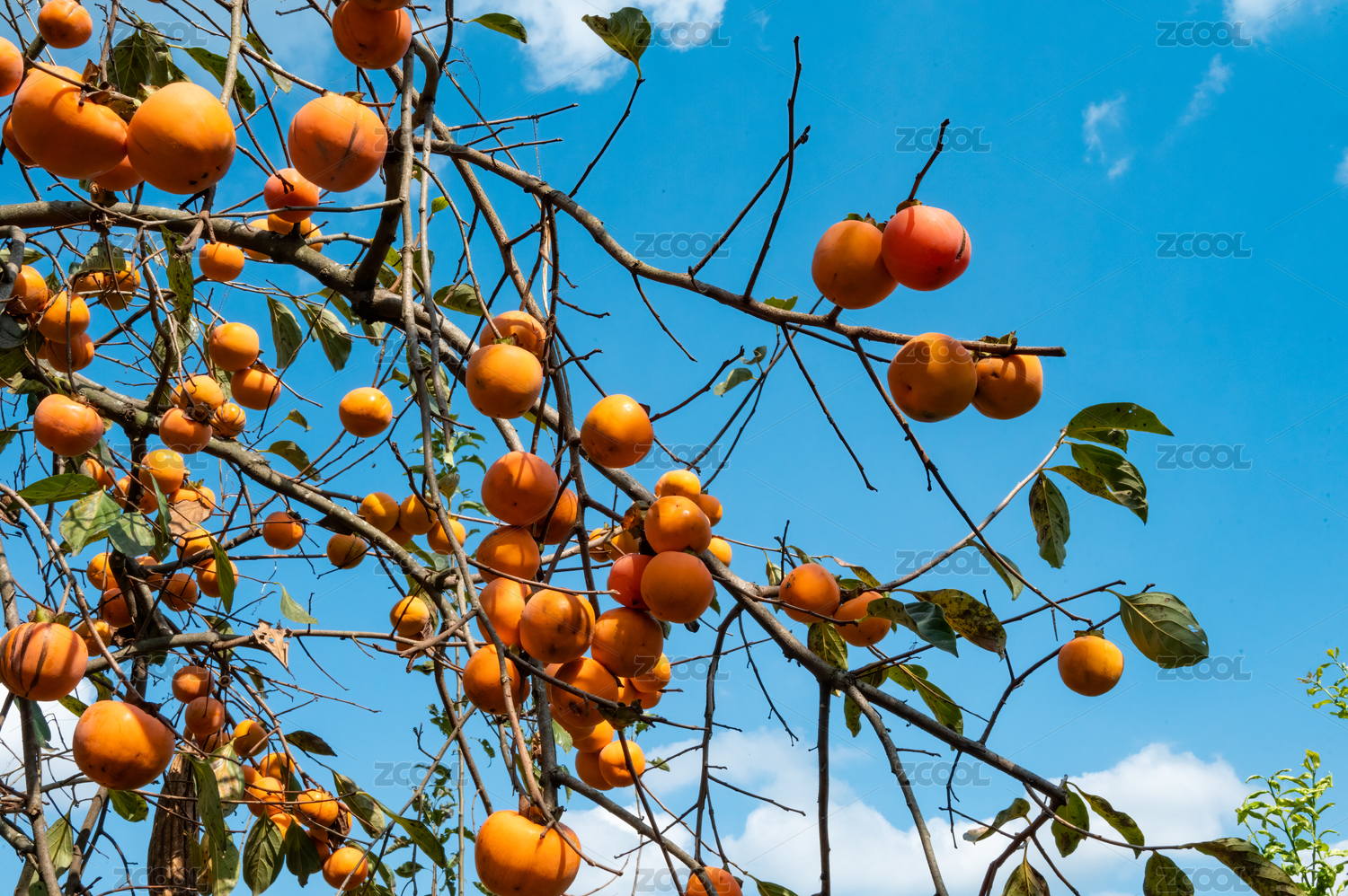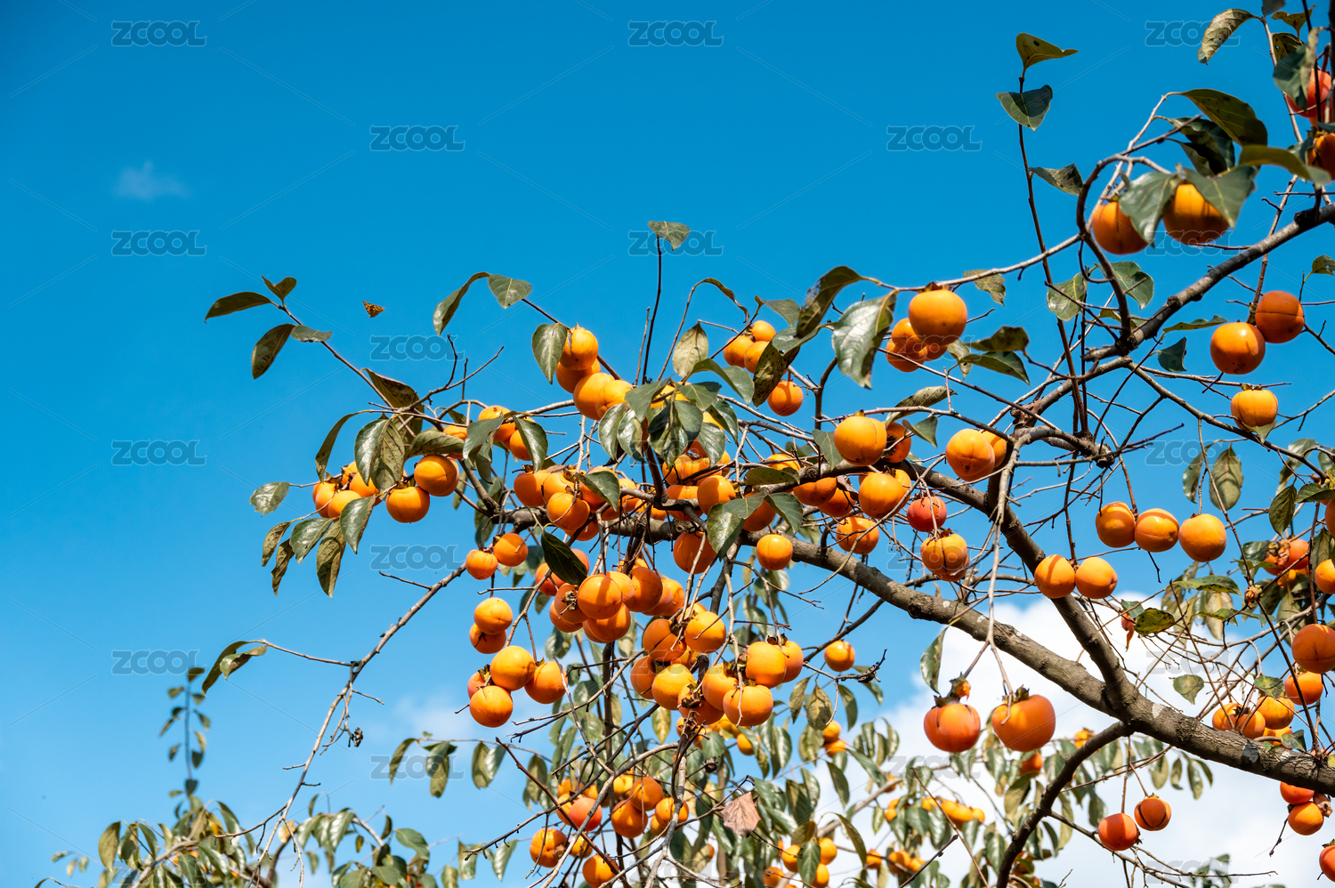 秋天的柿子樹枝頭掛滿成熟的紅柿子