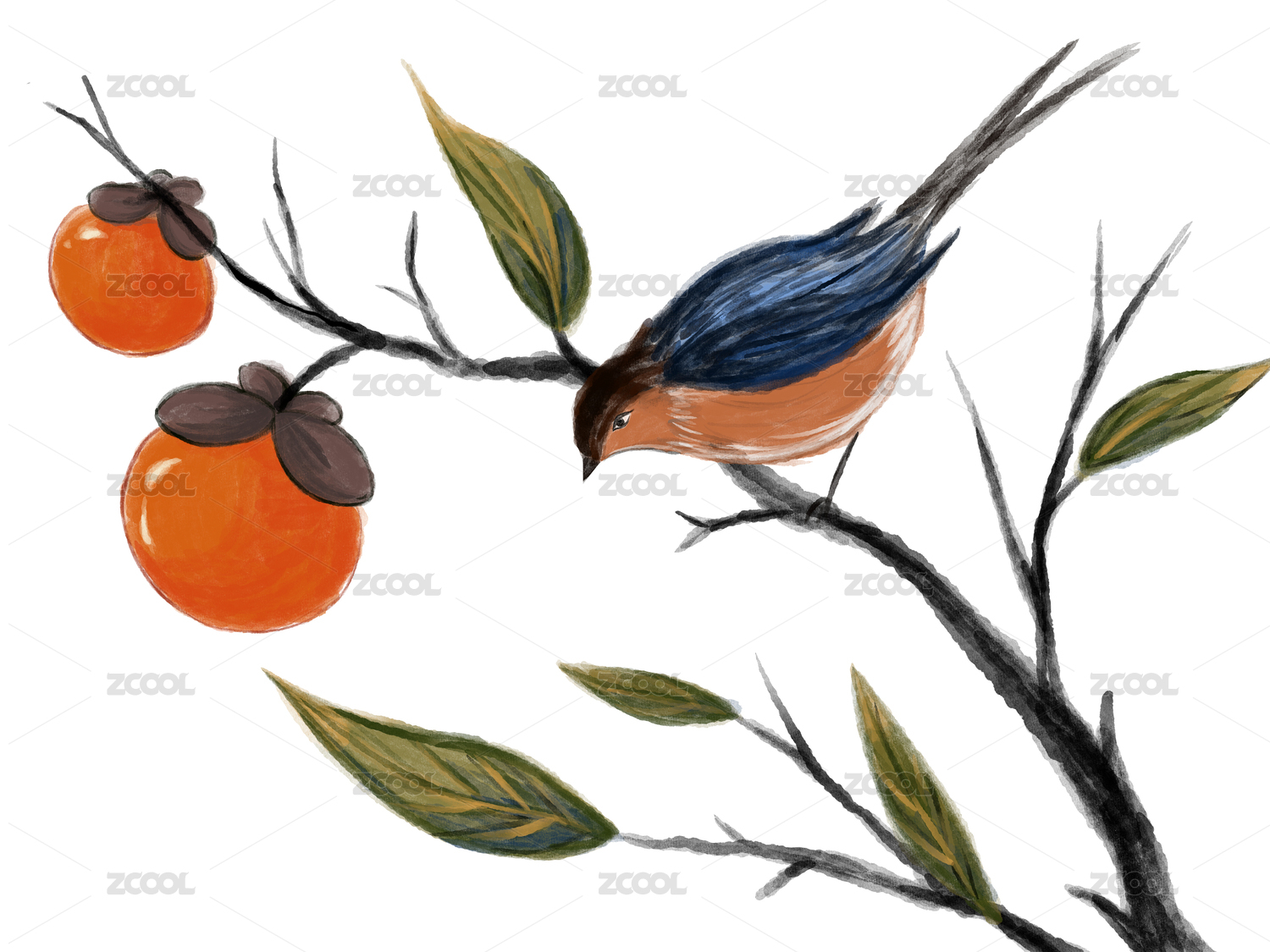 熟透橙色柿子枝頭鳥霜降國風(fēng)柿子和鳥元素