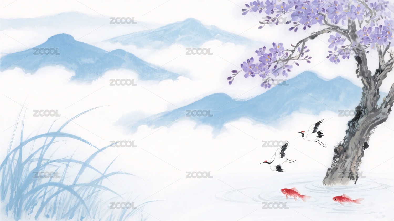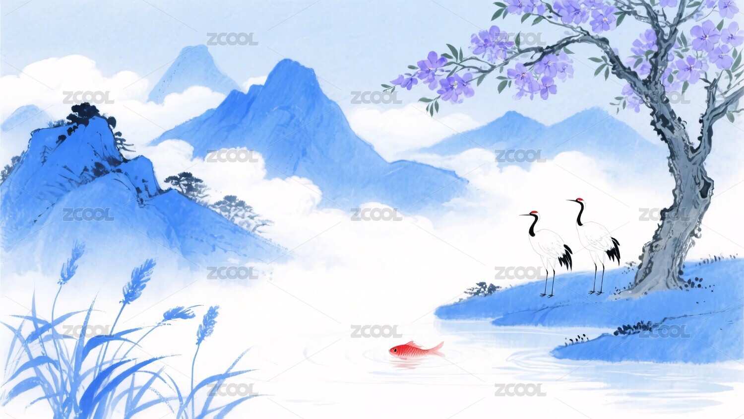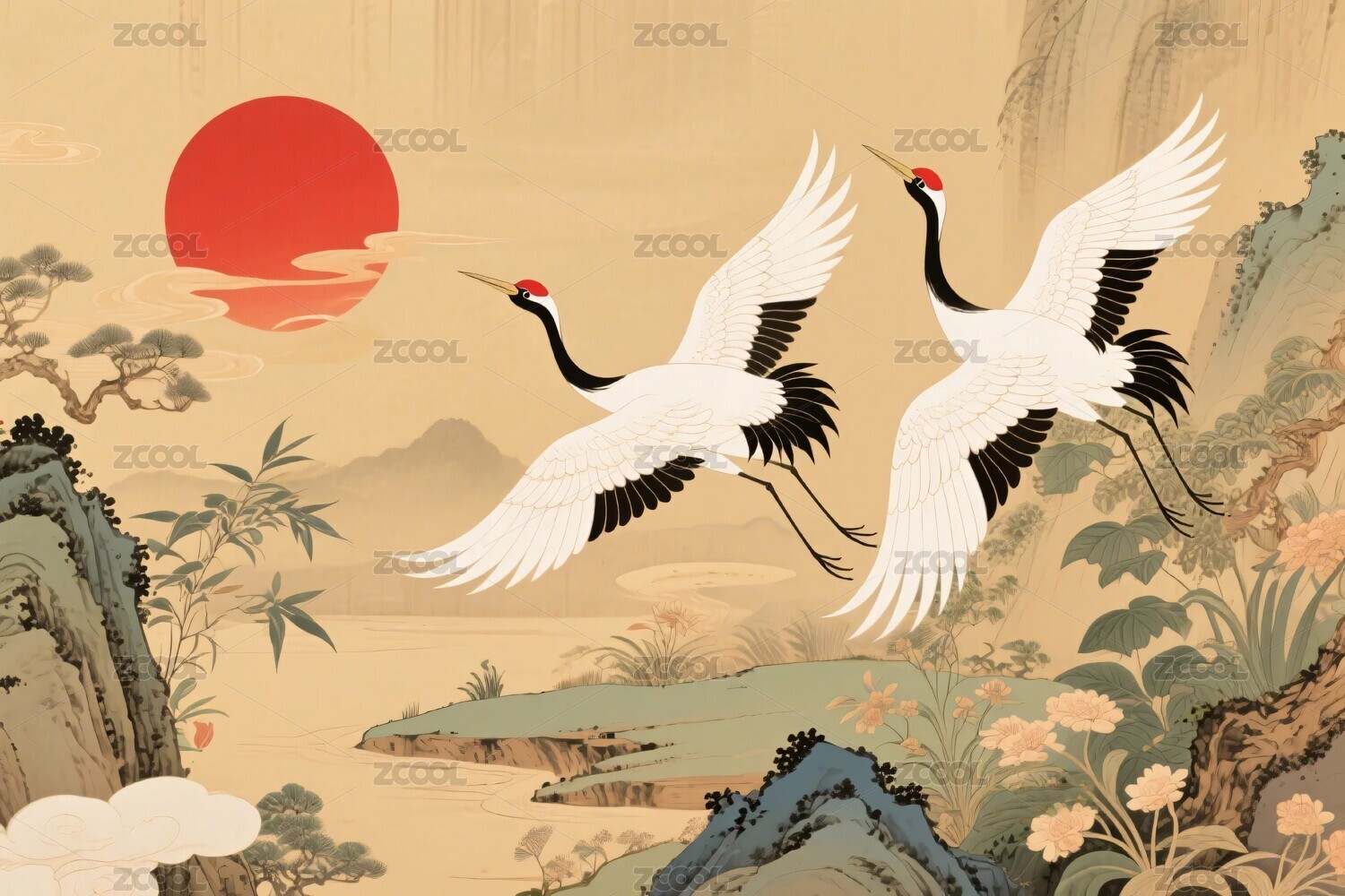丹頂鶴山水插畫