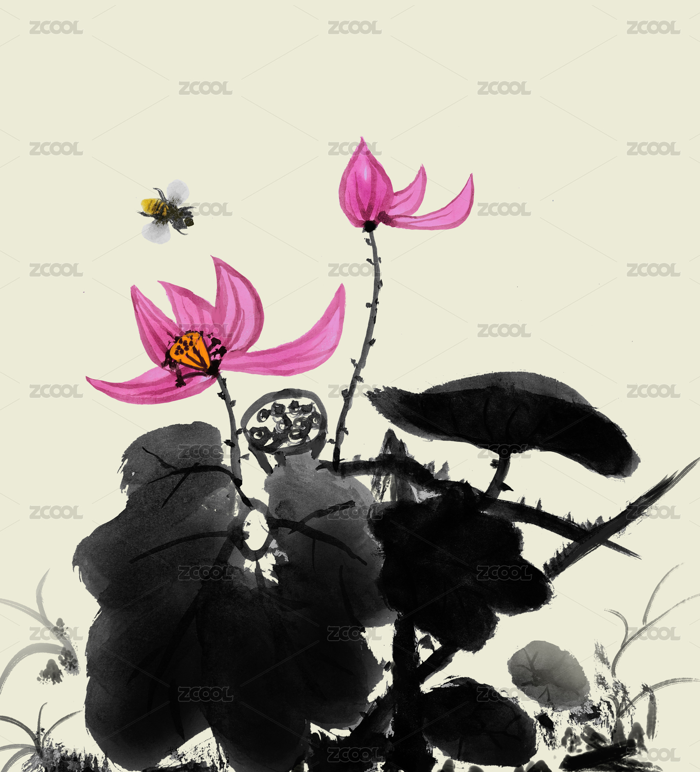 水墨古風(fēng)百合花國(guó)畫無骨花鳥圖案裝飾畫設(shè)計(jì)
