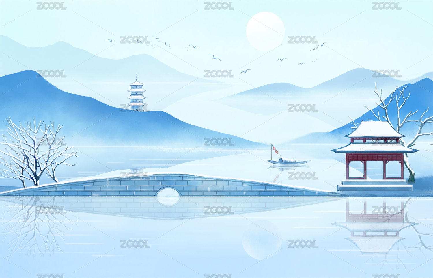 國風寫意山水畫斷橋圓月