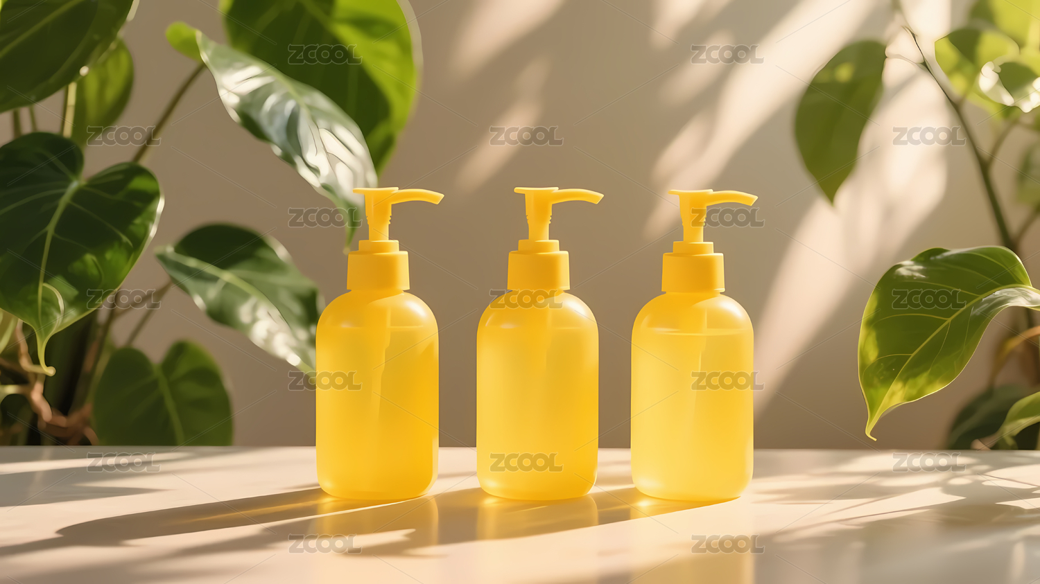黃色泵式瓶綠色植物光影