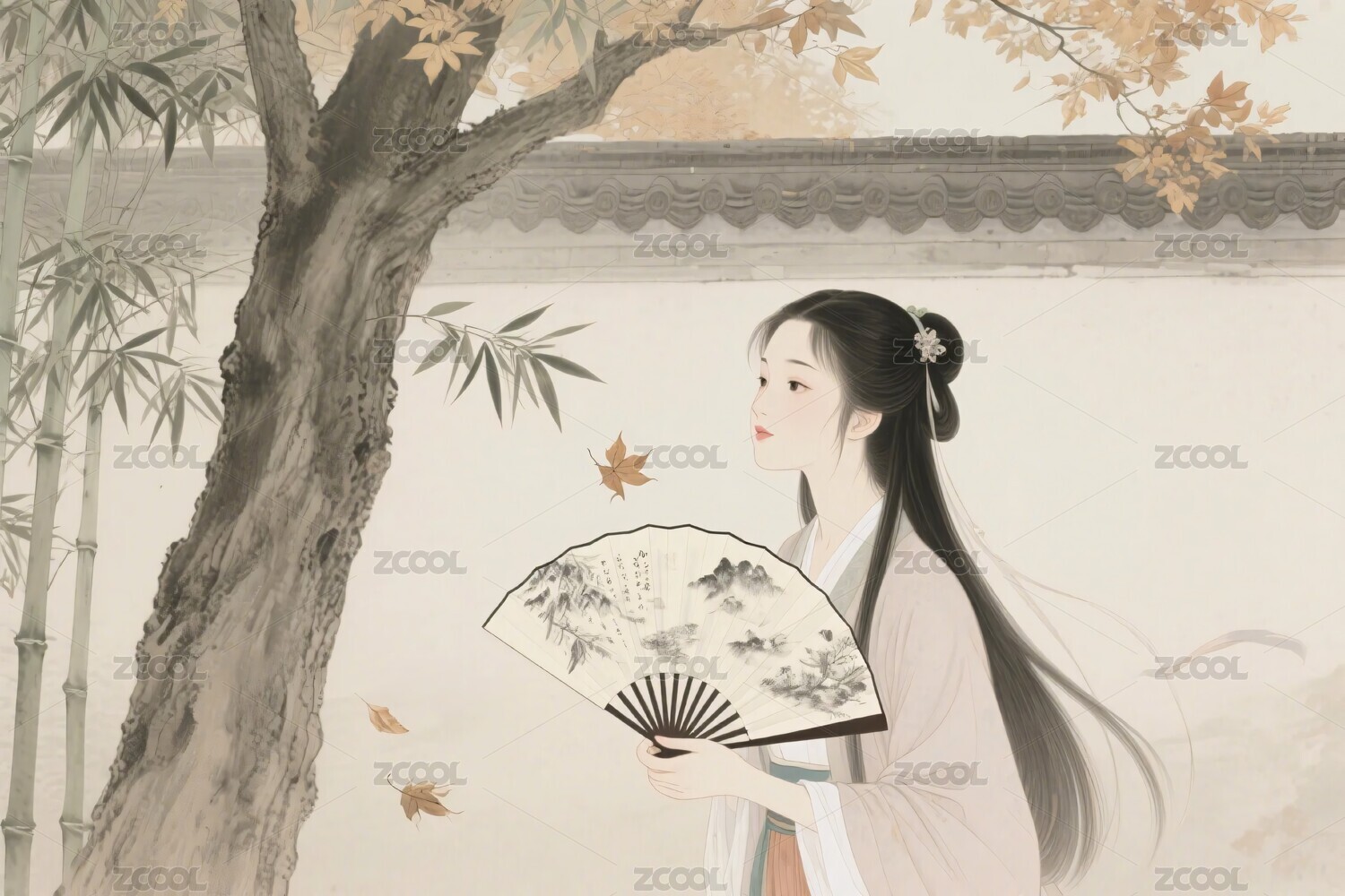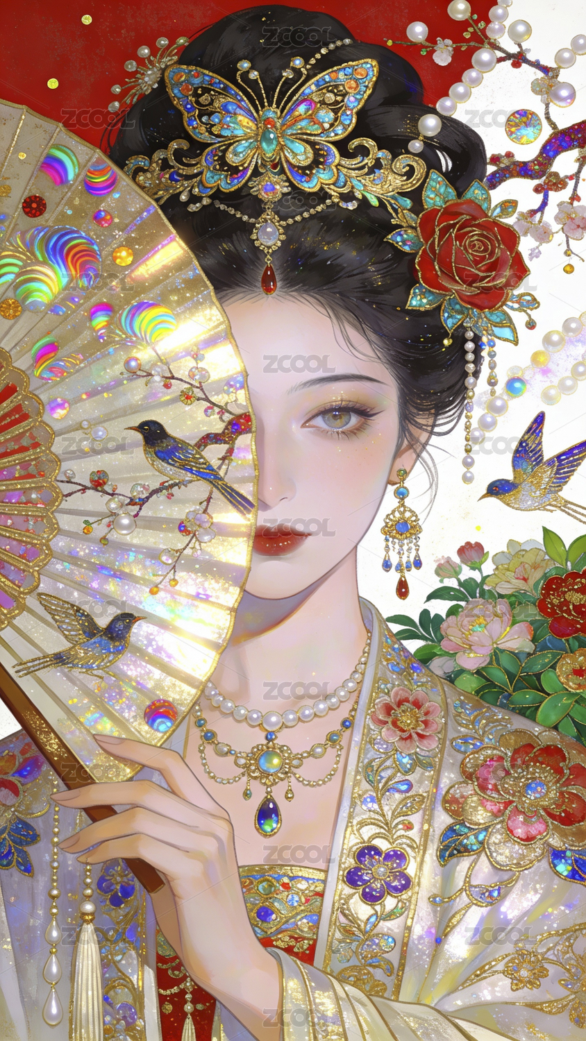 古風(fēng)美人手持折扇華麗漢服女子插畫