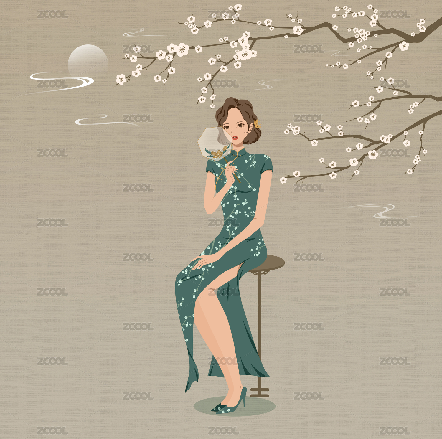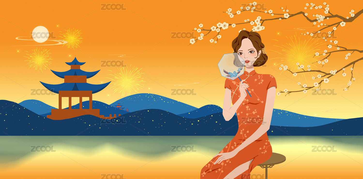 穿旗袍的女人中國風(fēng)山水風(fēng)景插畫