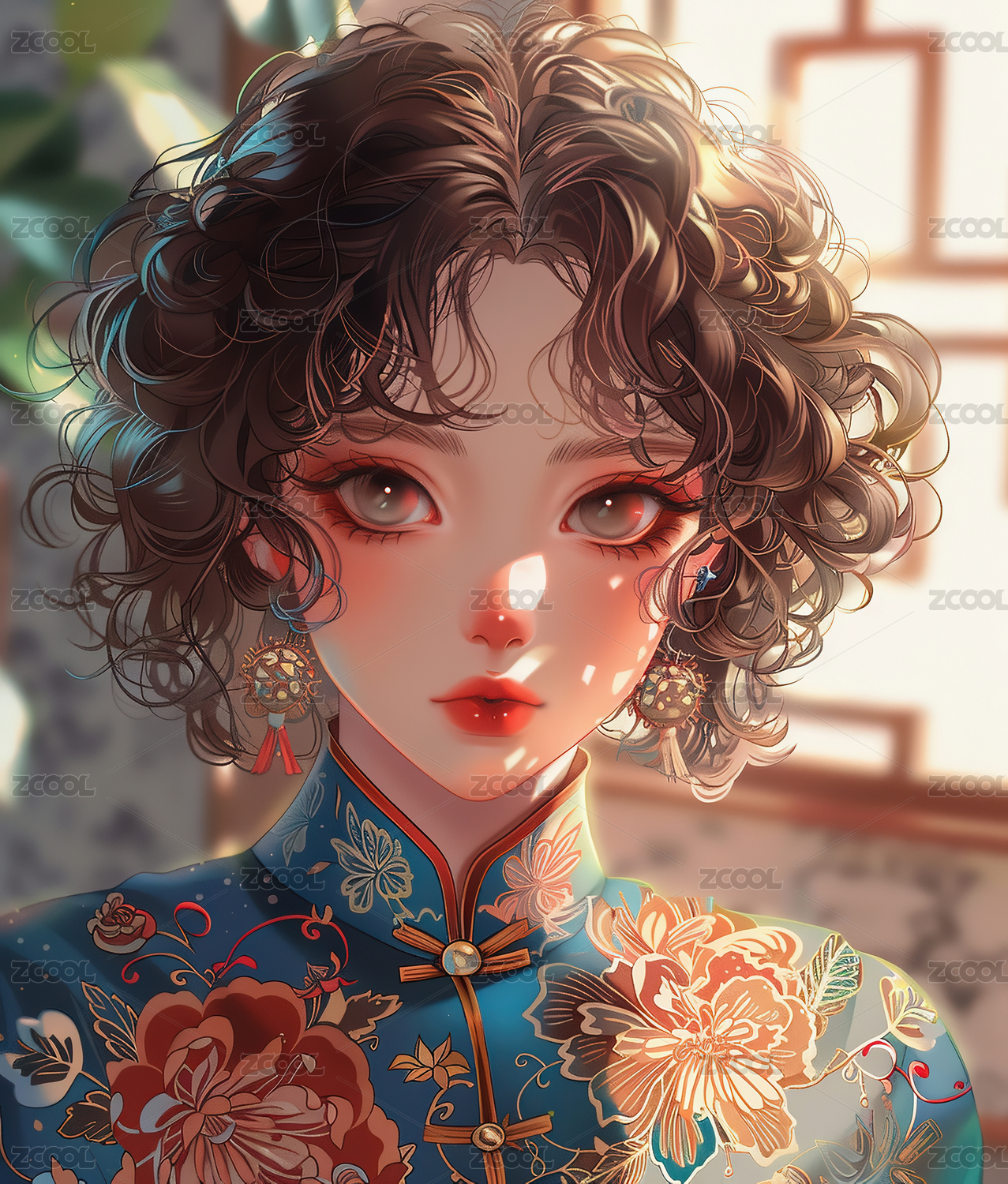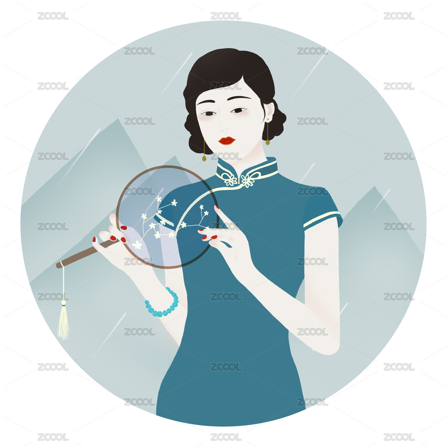 民國穿旗袍女人新中式裝飾畫服裝雜志封面畫
