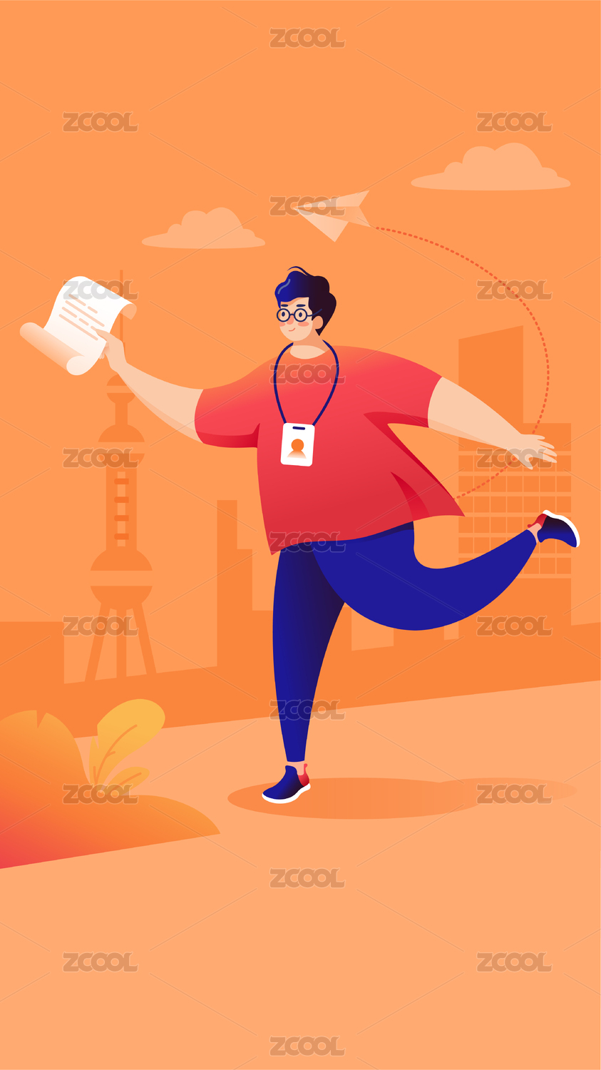 男職工手握體檢報(bào)告興奮的奔跑在城市背景下