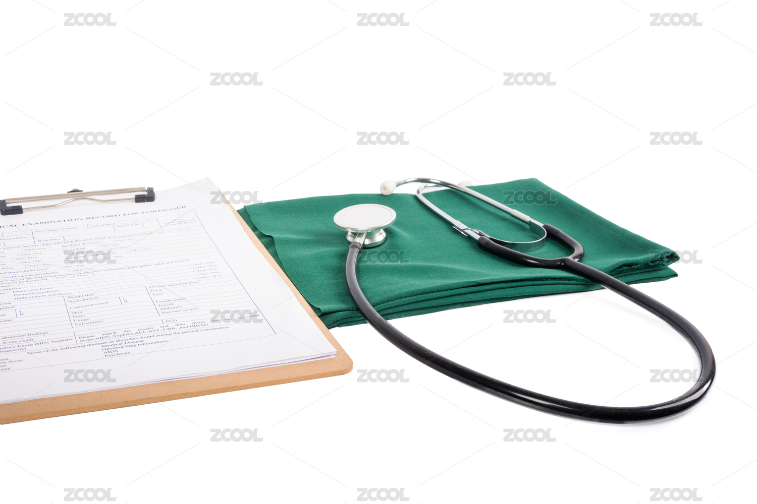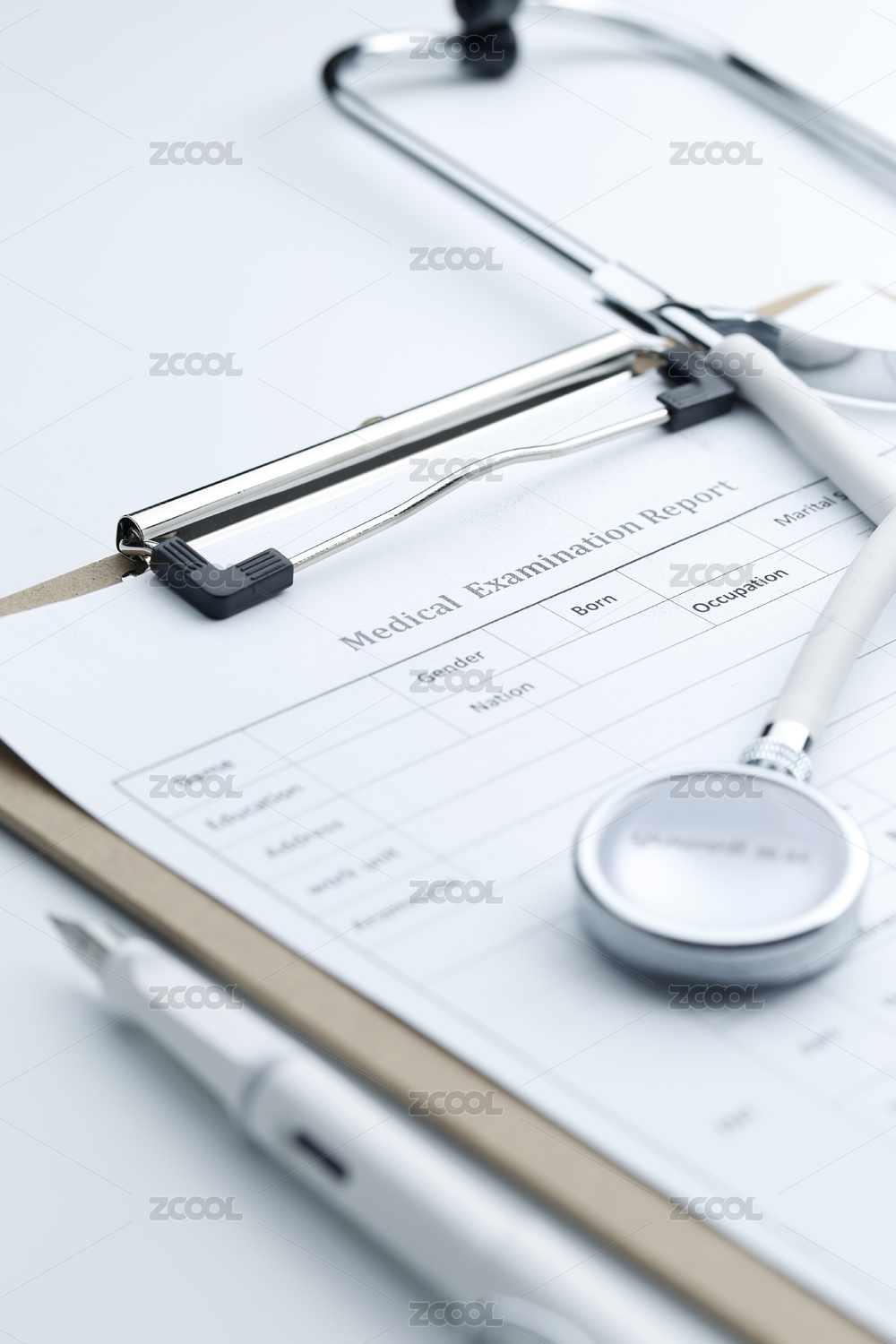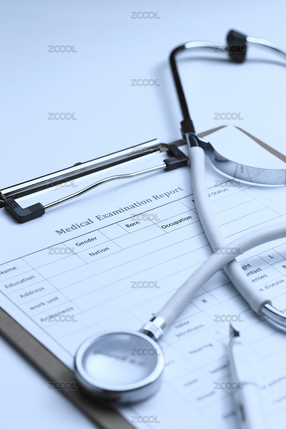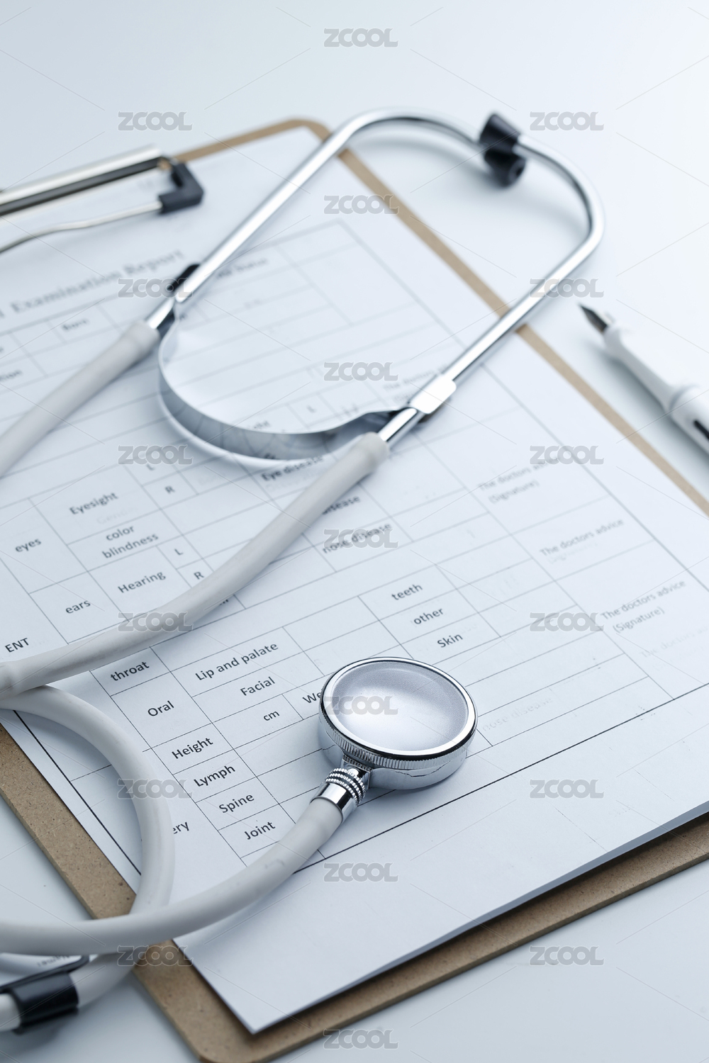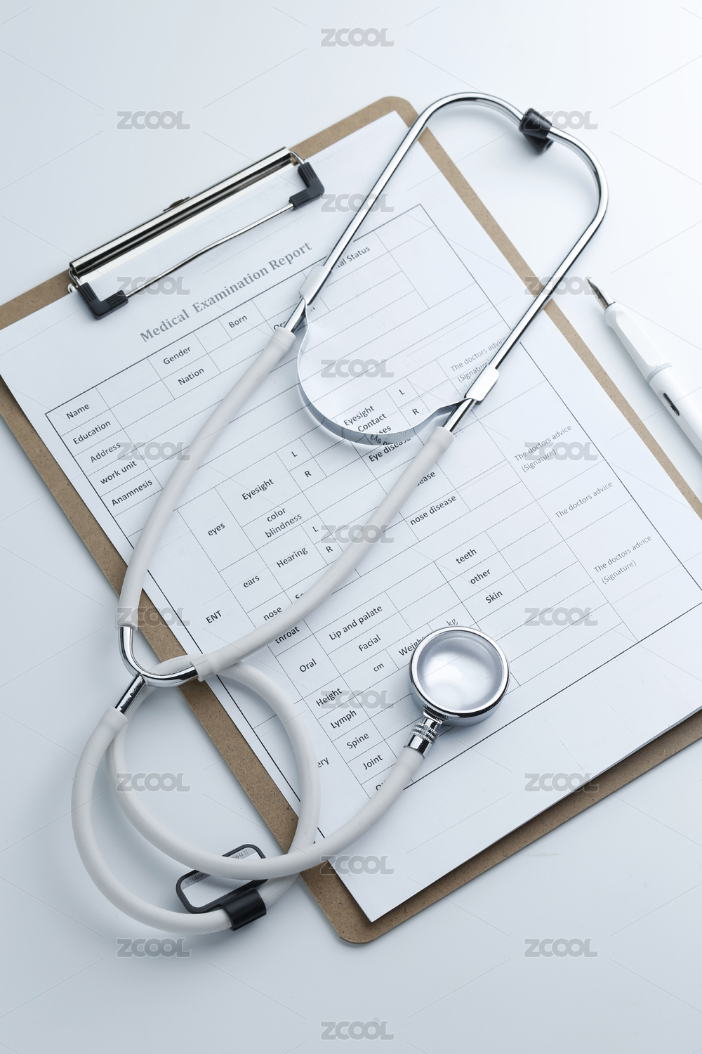 體檢報(bào)告和聽(tīng)診器放在白色桌面上