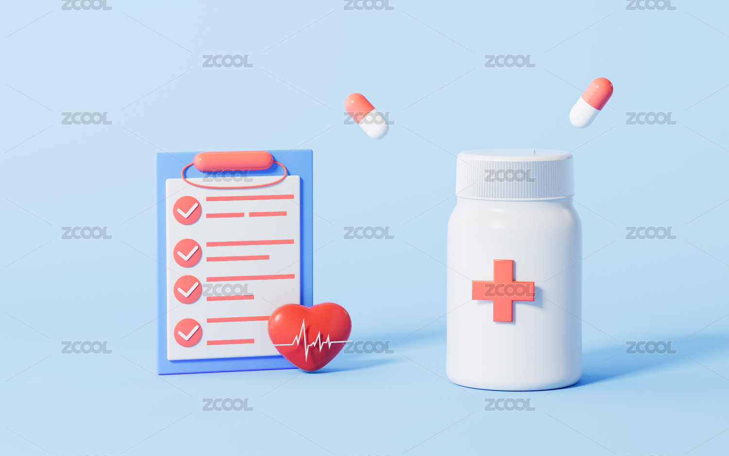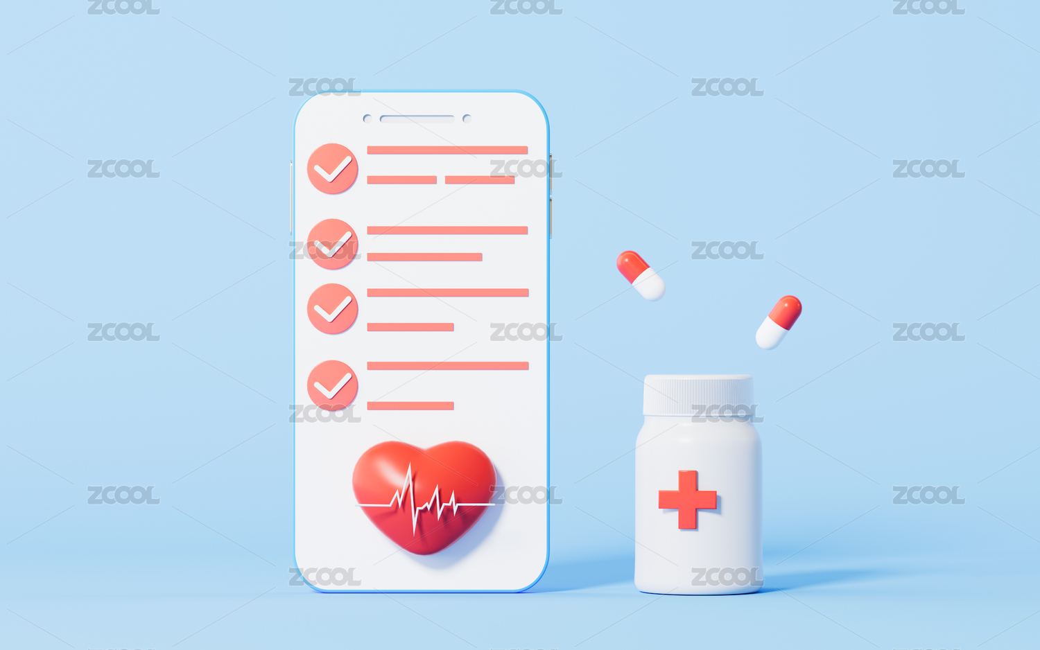 電子體檢報(bào)告和藥瓶 網(wǎng)絡(luò)就醫(yī)概念3D渲染