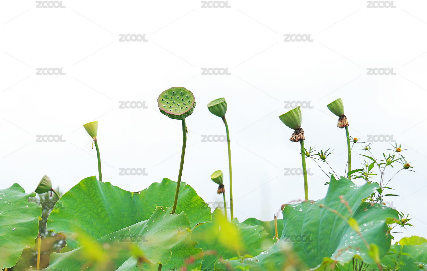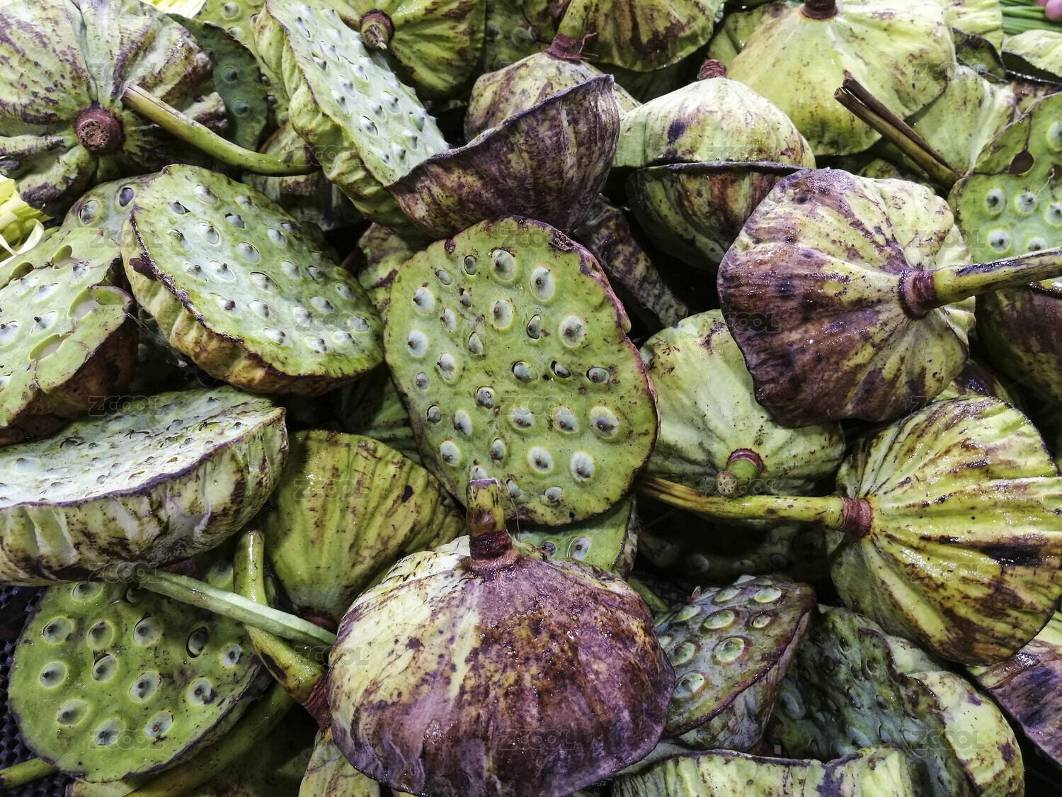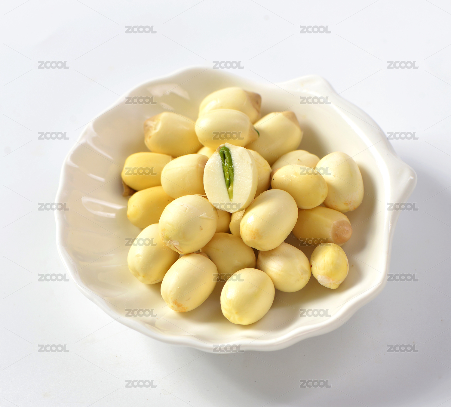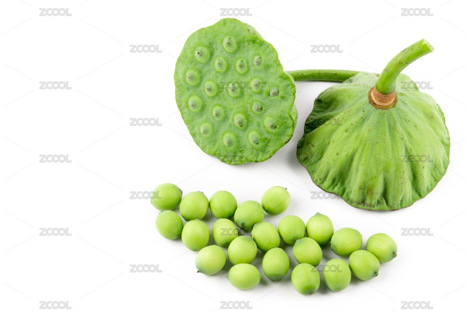 白色背景上放著兩個(gè)蓮蓬和一些新鮮蓮子