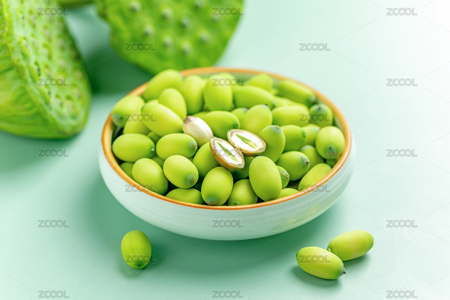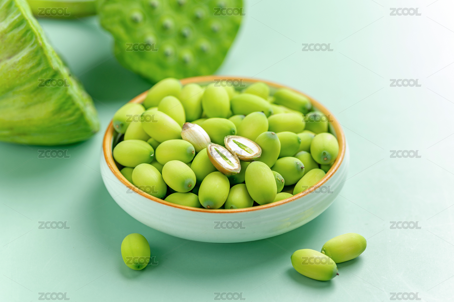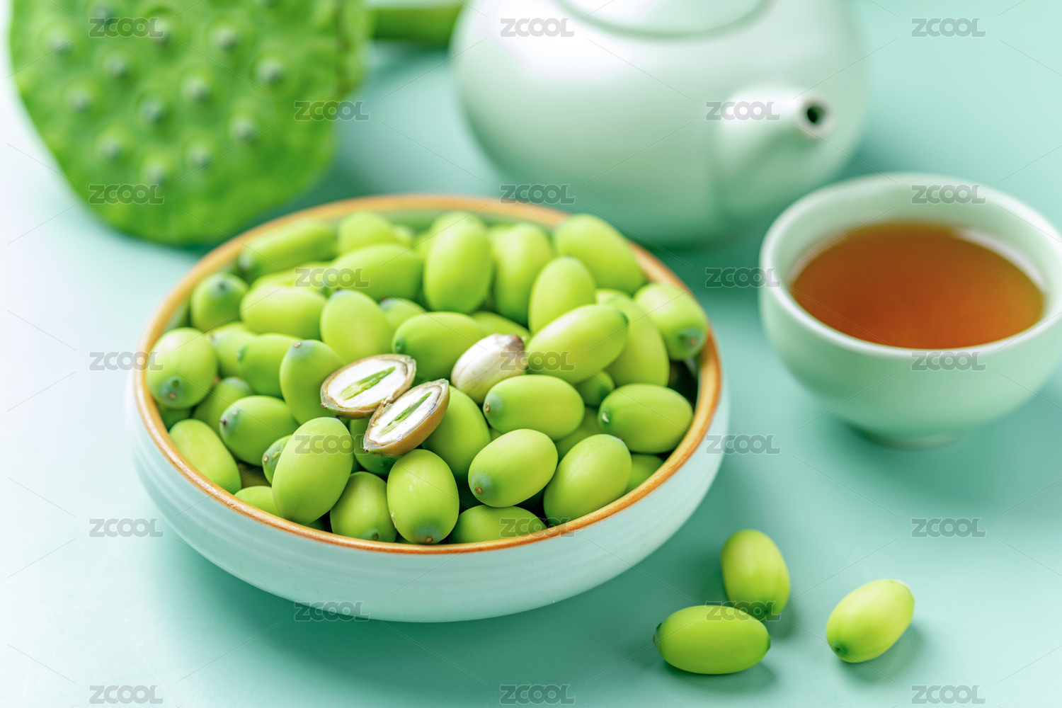 一盤蓮子擺放在綠色背景上旁邊放有蓮蓬茶水