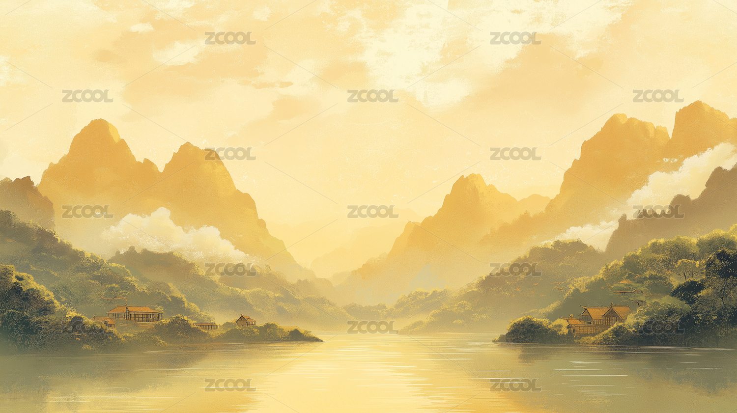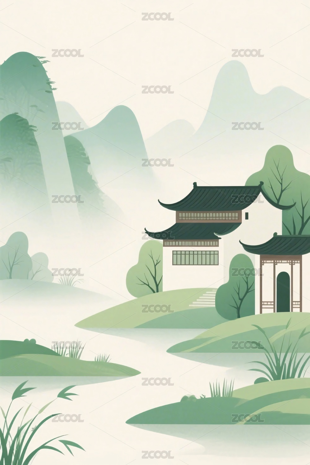 山水風格壁畫插畫