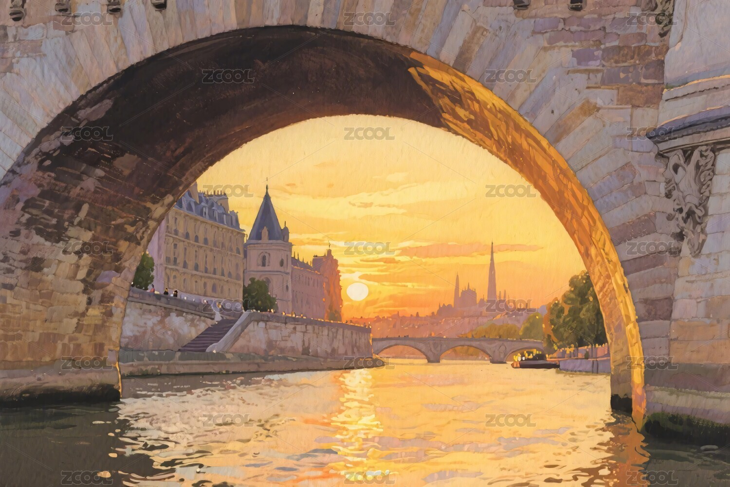 巴黎橋拱夕陽風景