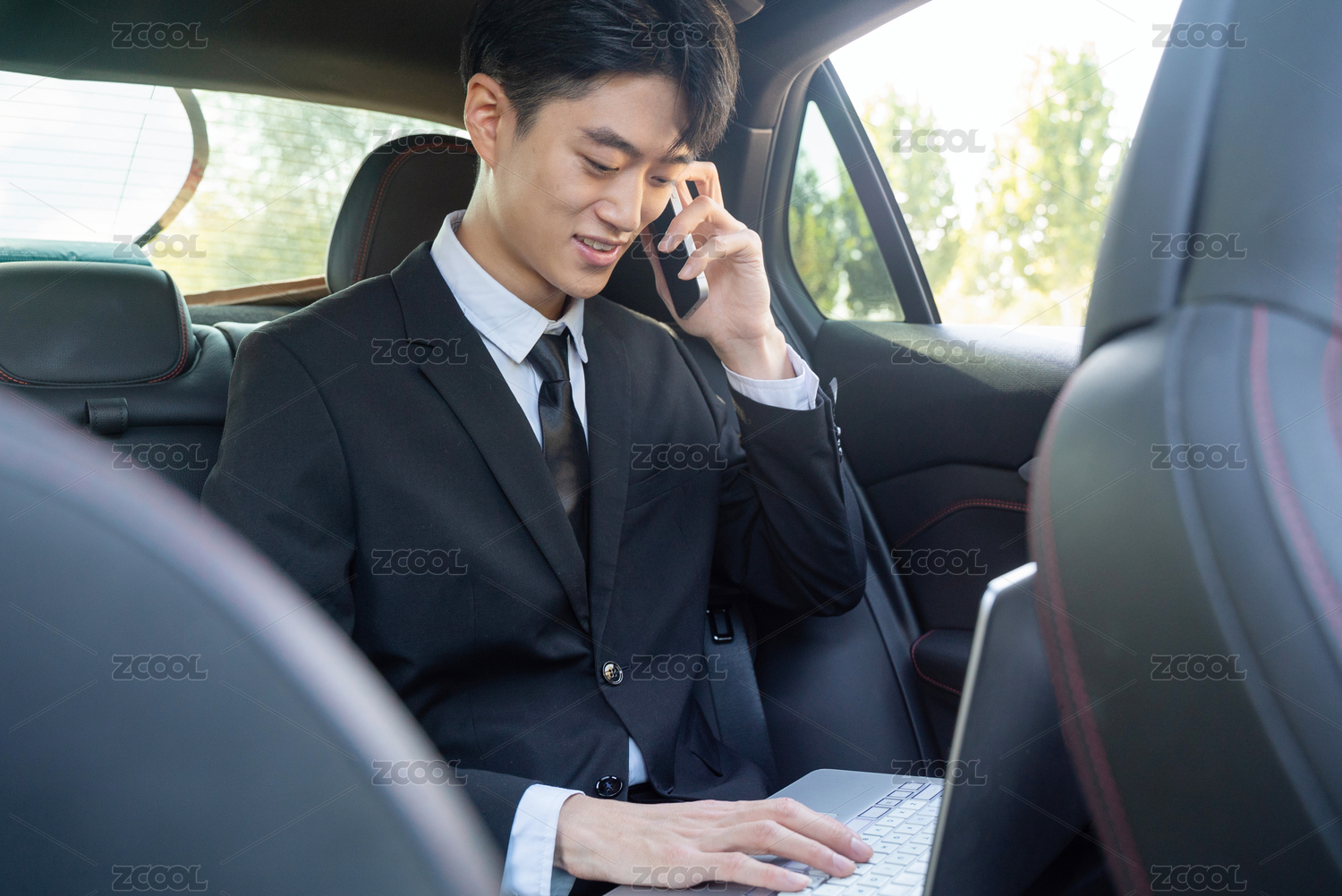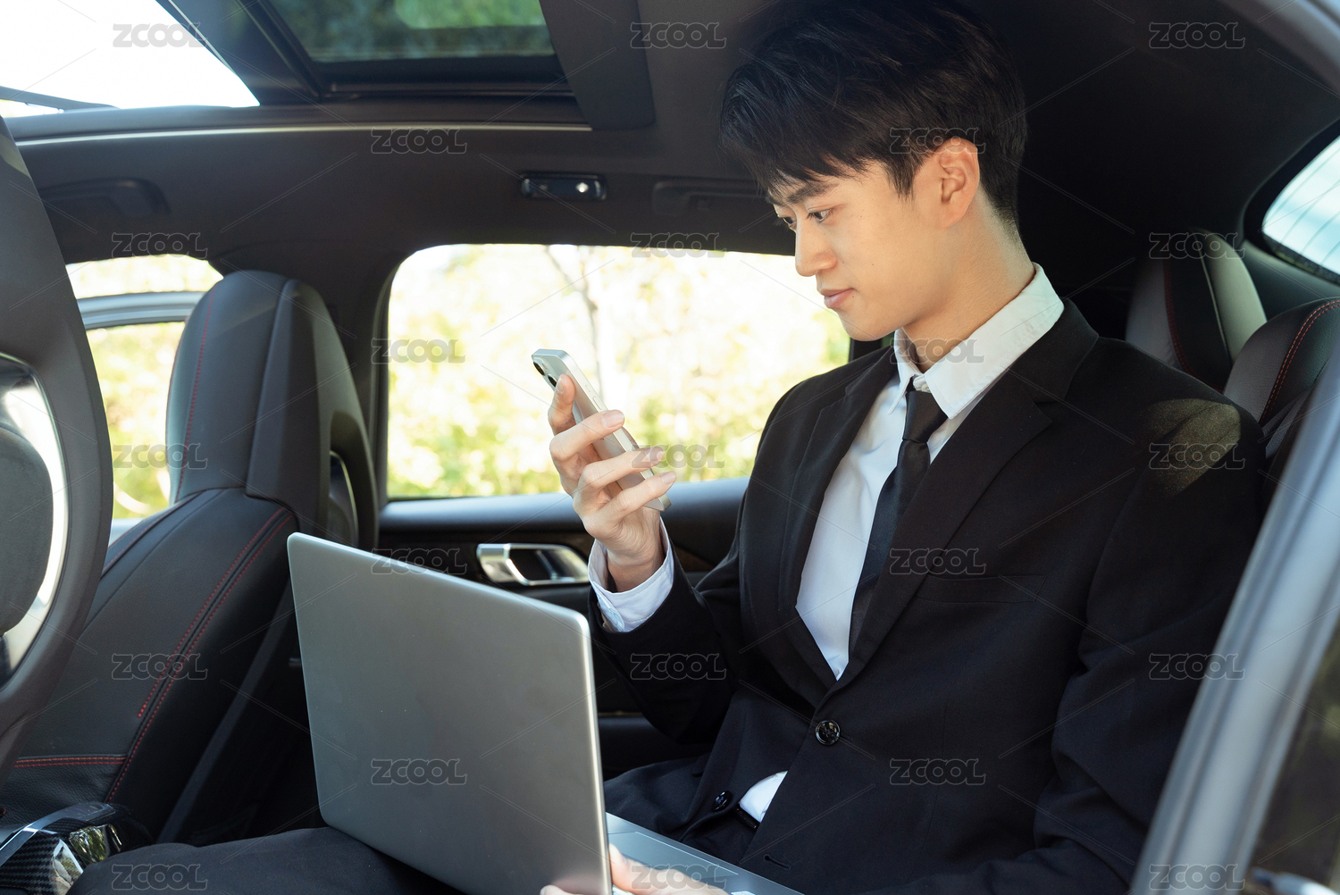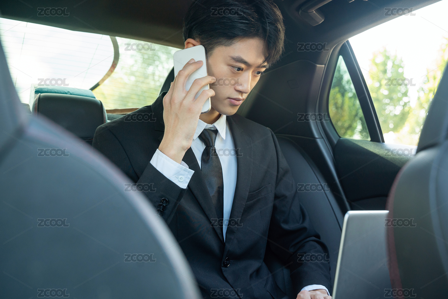 車內(nèi)電腦辦公西裝男青年手持手機