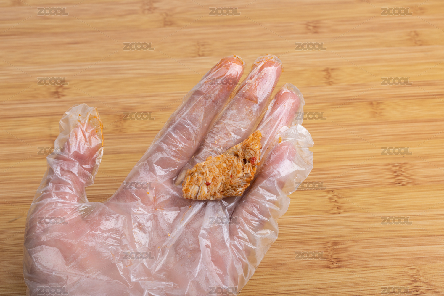 手戴一次性聚乙烯材料食品手套抓瘦肉食物