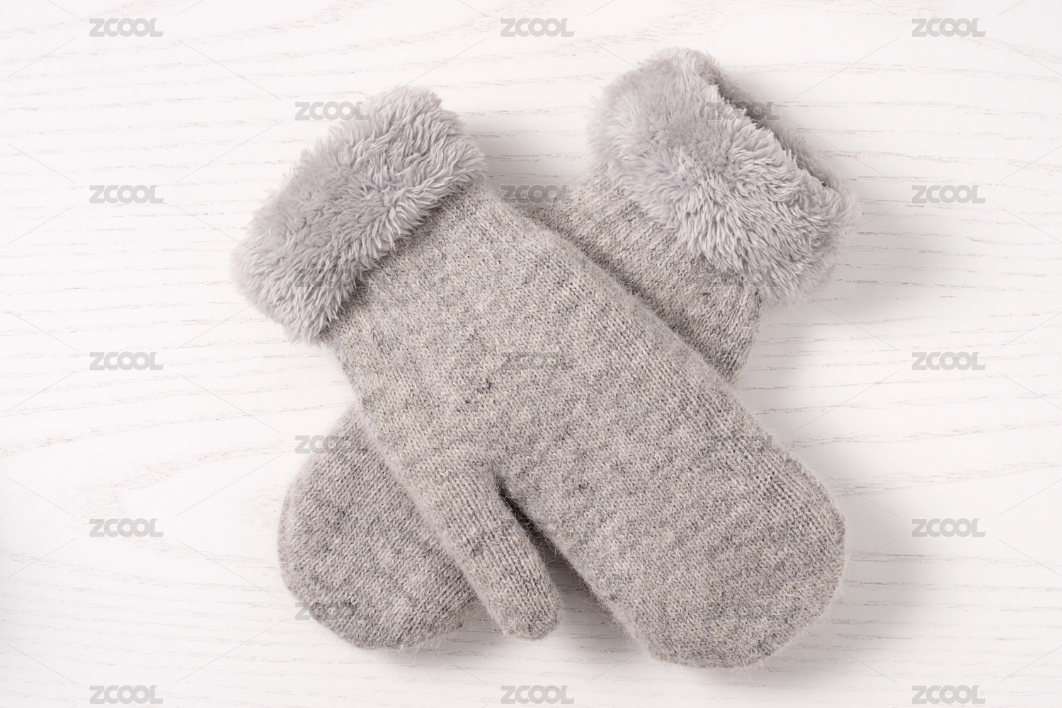 上帝視角下放在白色木紋桌面上的灰色棉手套