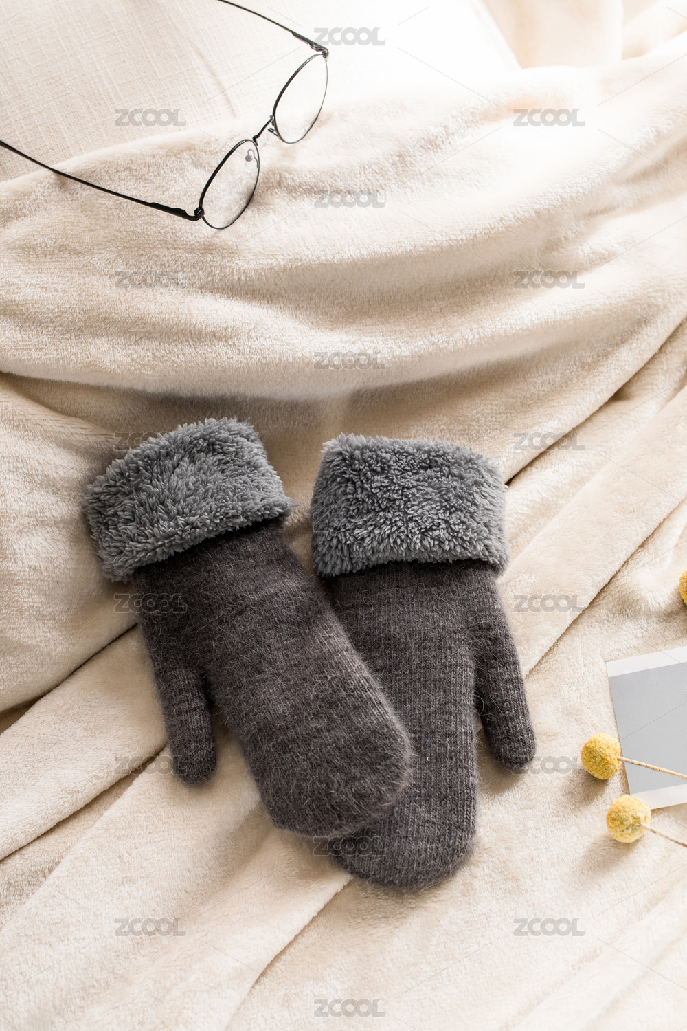 毛毯上有一副眼鏡和一雙冬天的手套
