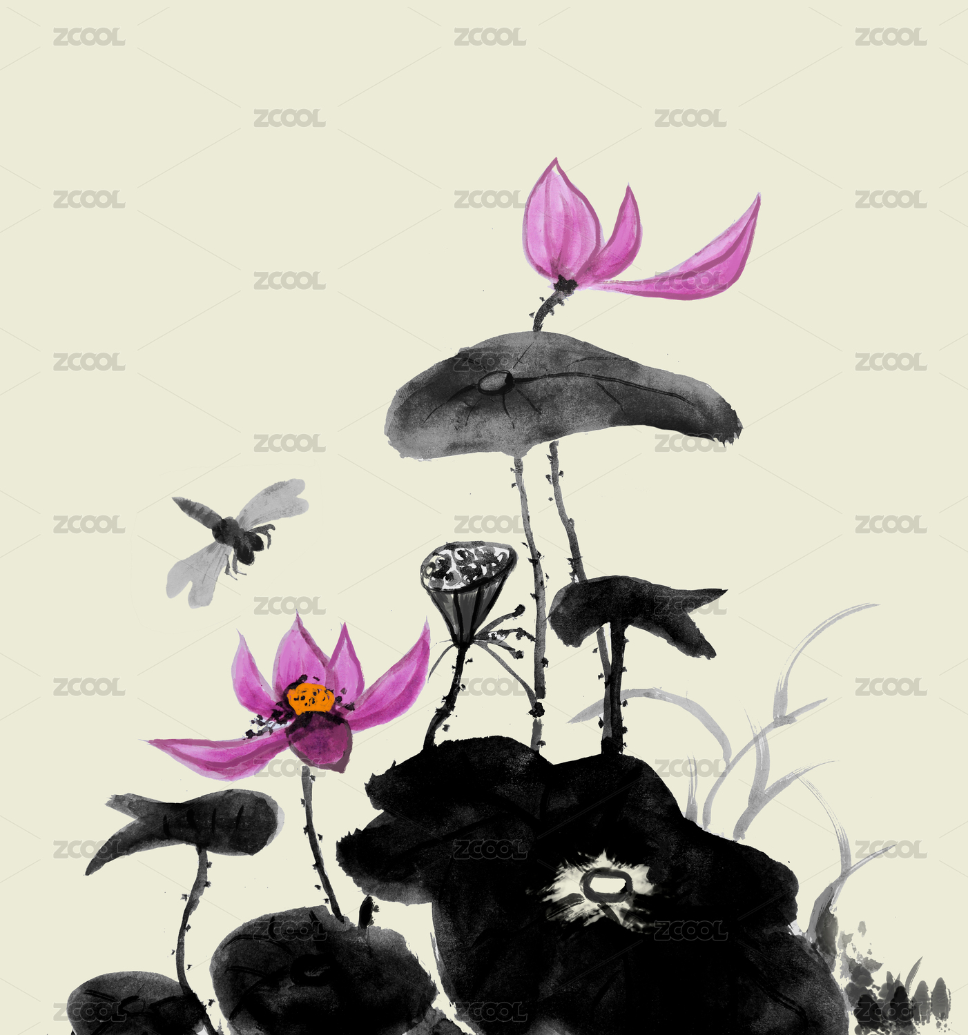 荷花蜻蜓水墨畫