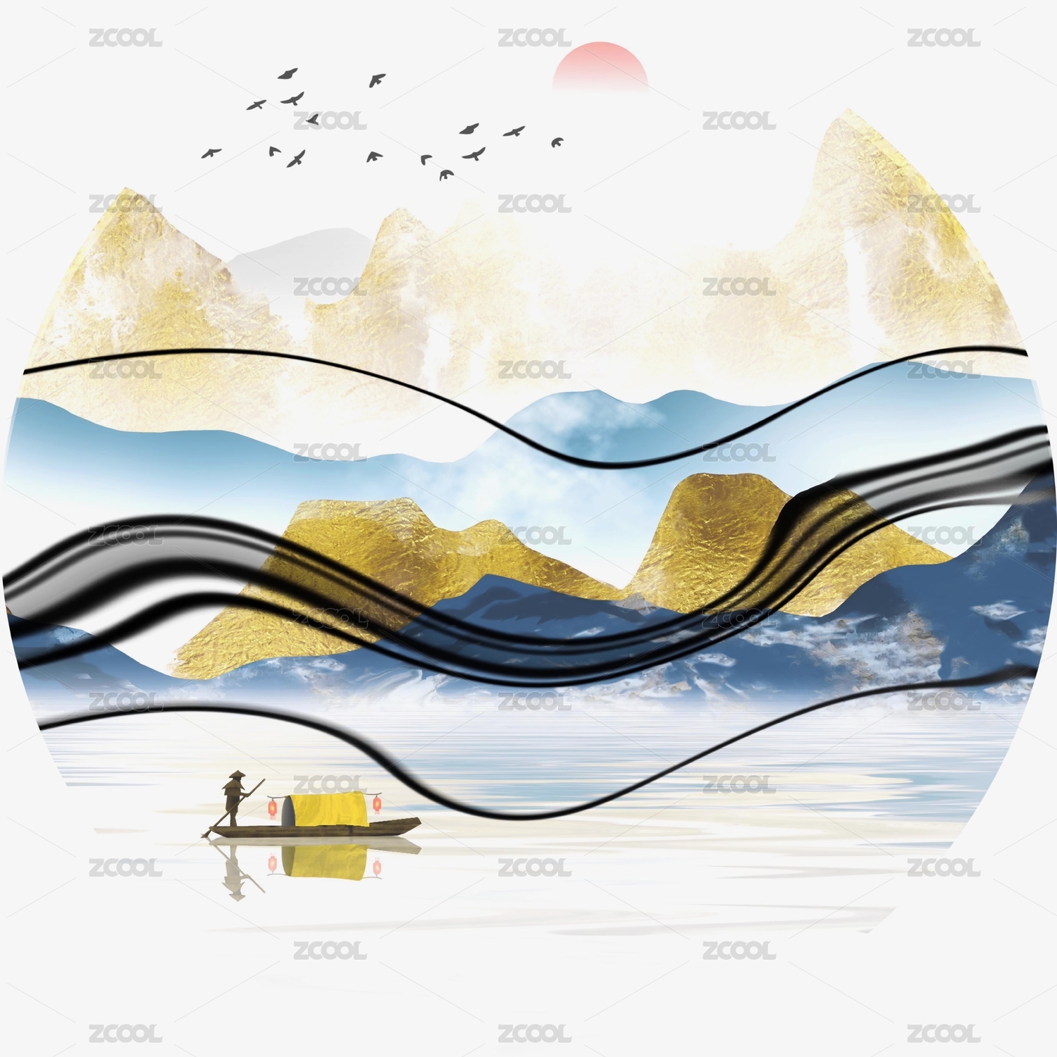 藍(lán)金新中式輕奢山水寫意裝飾畫