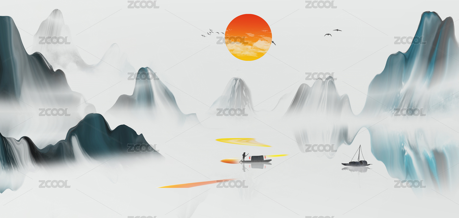 藍(lán)色輕奢新中式抽象意境山水裝飾畫