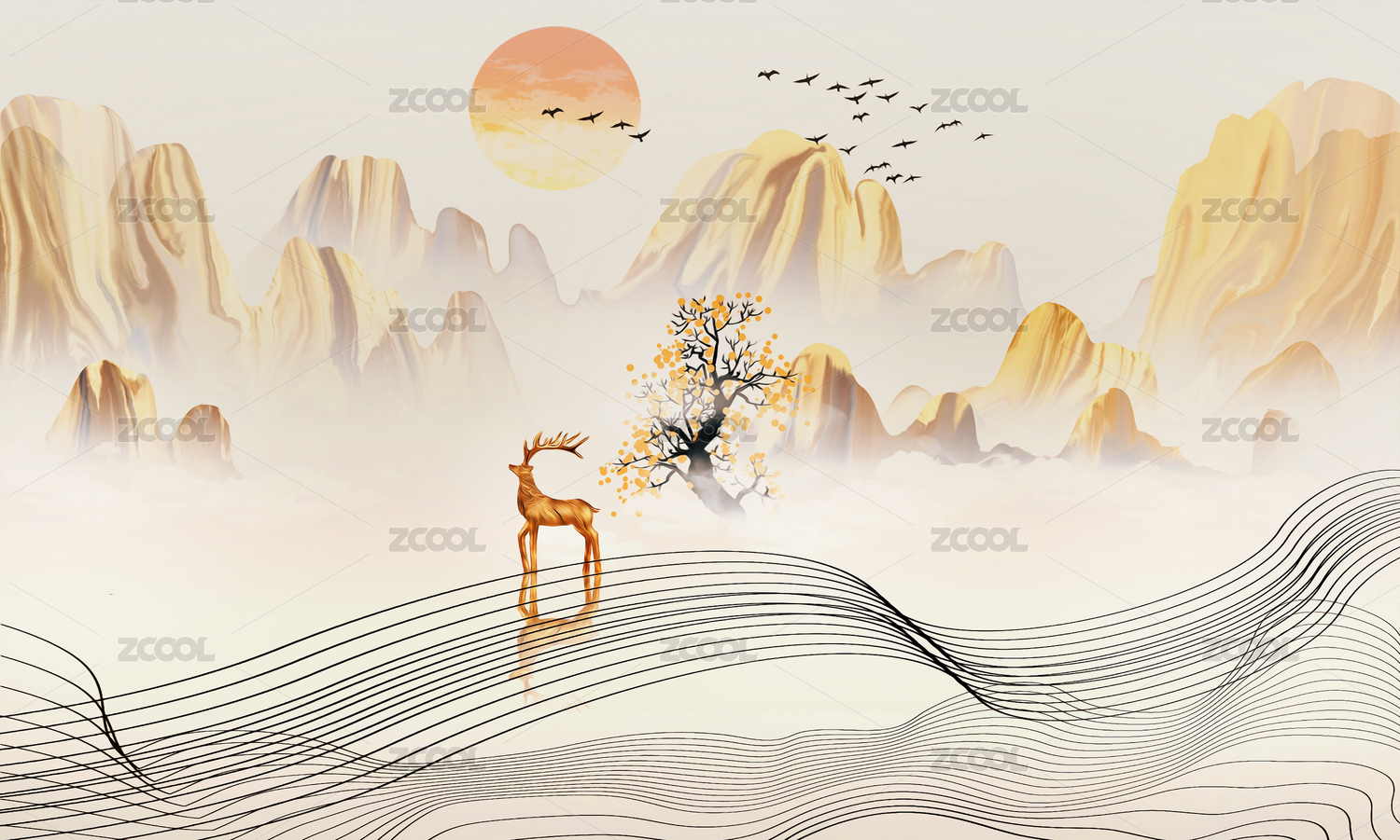 手繪新中式金色山水輕奢抽象藝術(shù)裝飾畫