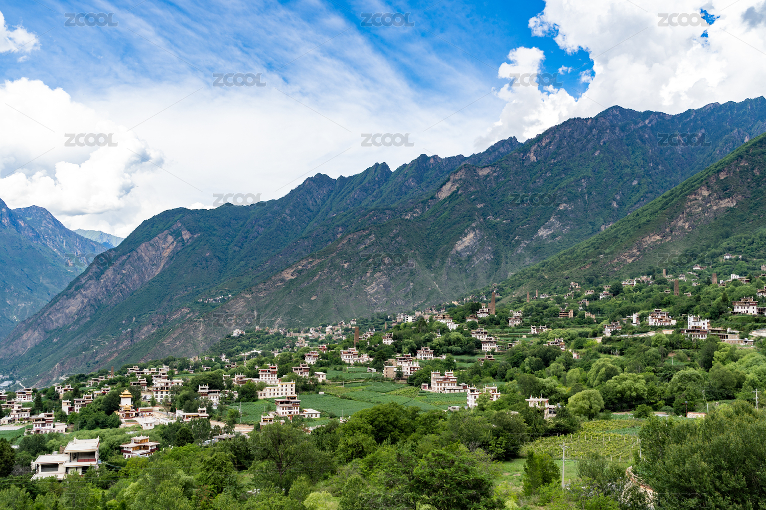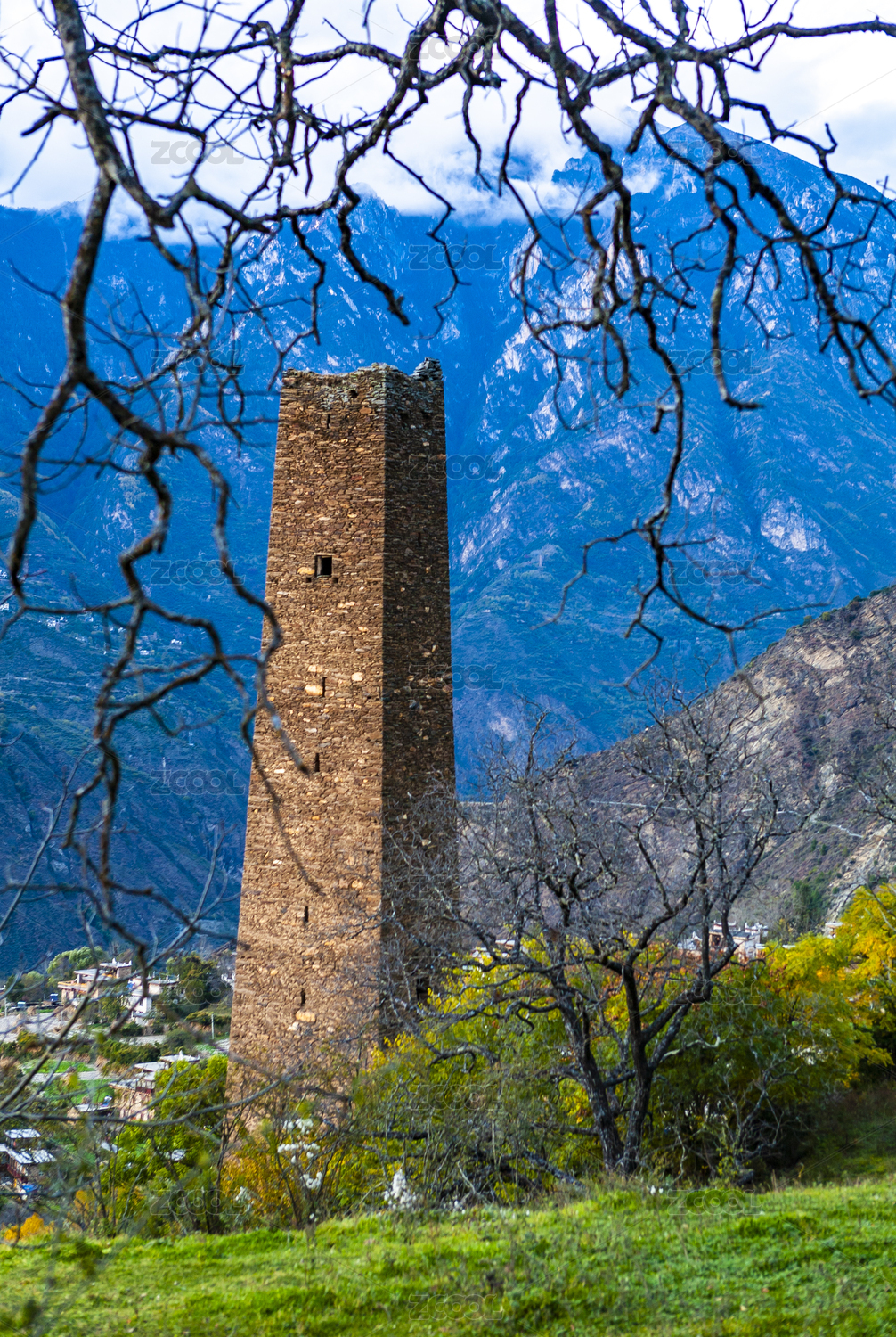 中國(guó)四川甘孜丹巴中路藏寨的碉樓和村寨風(fēng)光