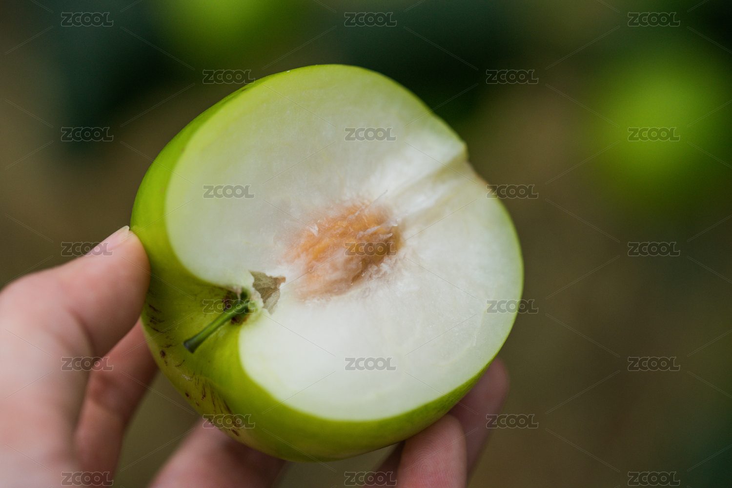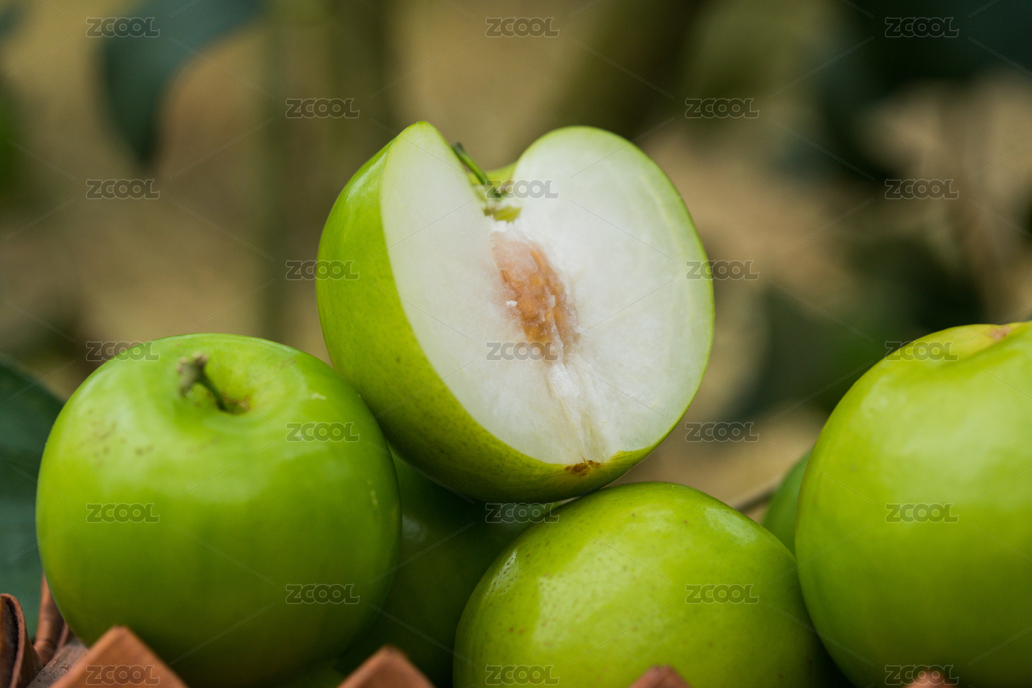 明亮房間桌面上一盤綠色水果梨及切開(kāi)的切面