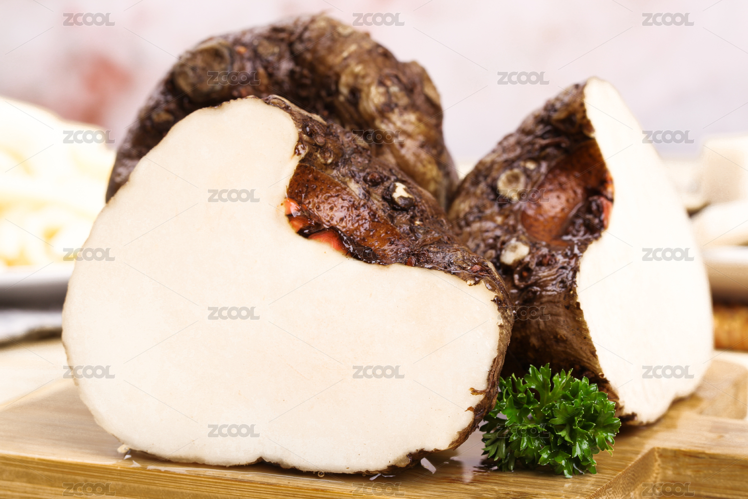 木板上放著一個(gè)完整的鮮魔芋和半邊切面蒟蒻