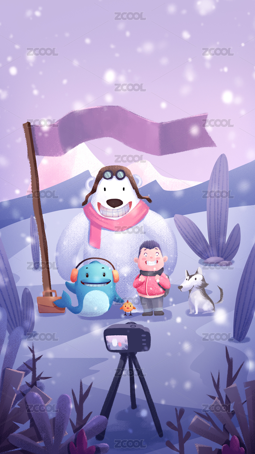 冬季北極熊海豚小男孩哈士奇小雞組成的旅行團(tuán)在冬天寒冷的地方冒著雪開(kāi)心的旅行并拍照留念