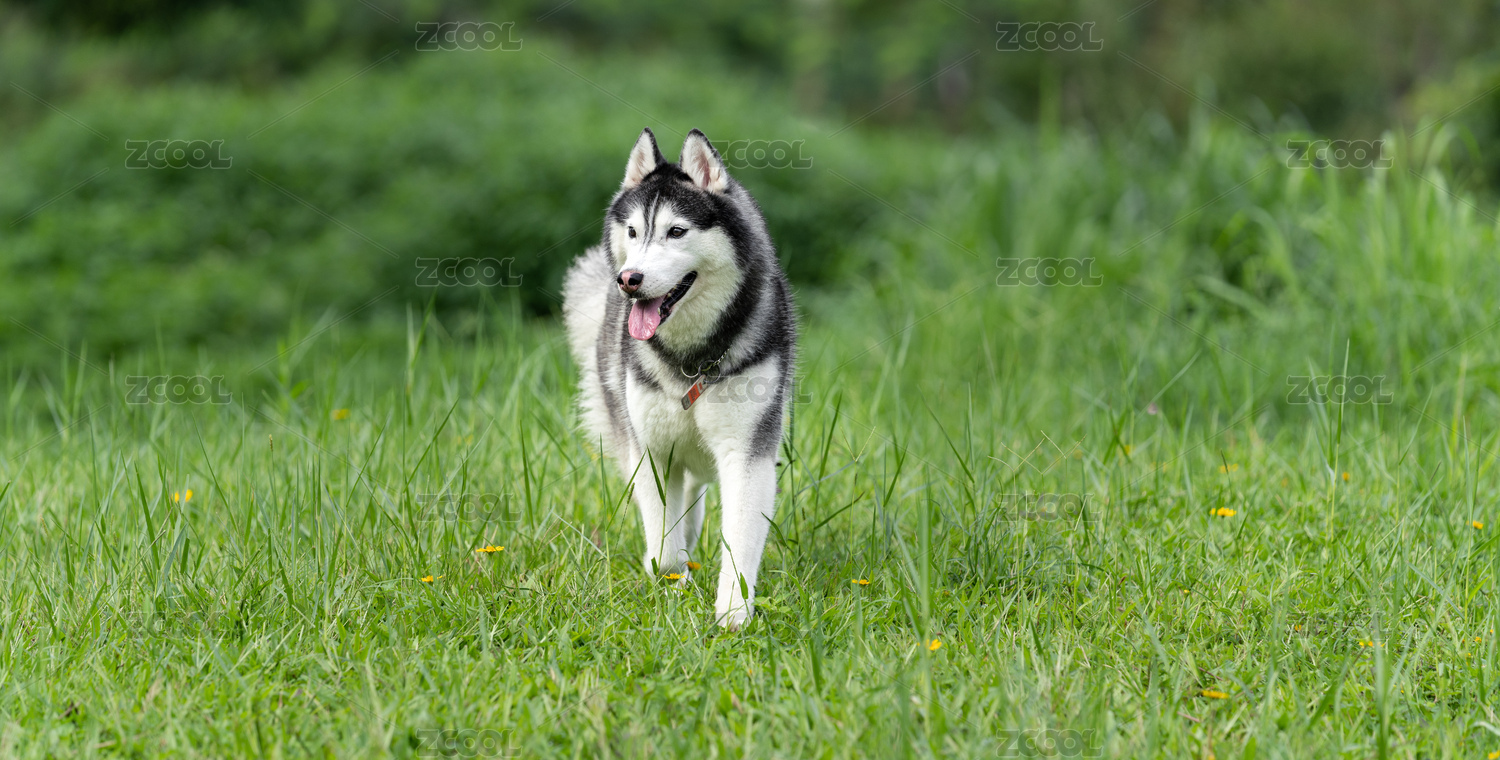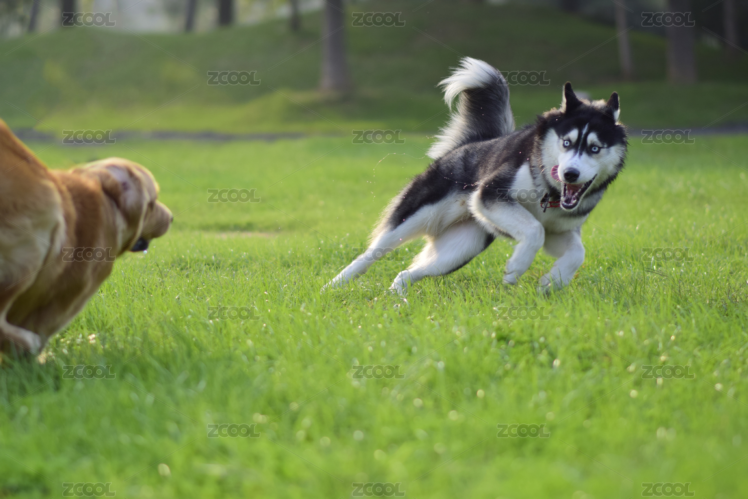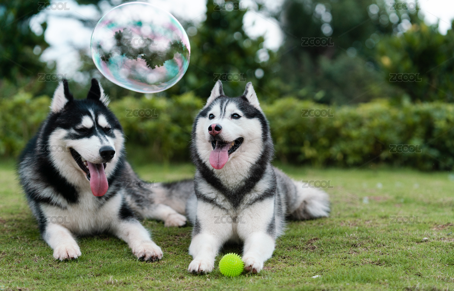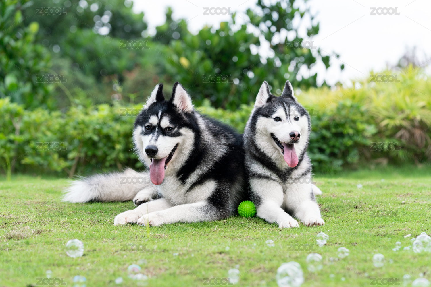 兩只開(kāi)心的哈士奇在戶外玩耍