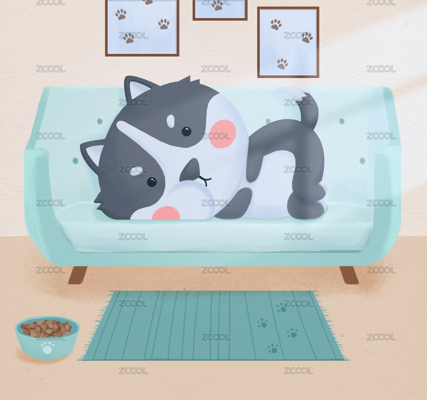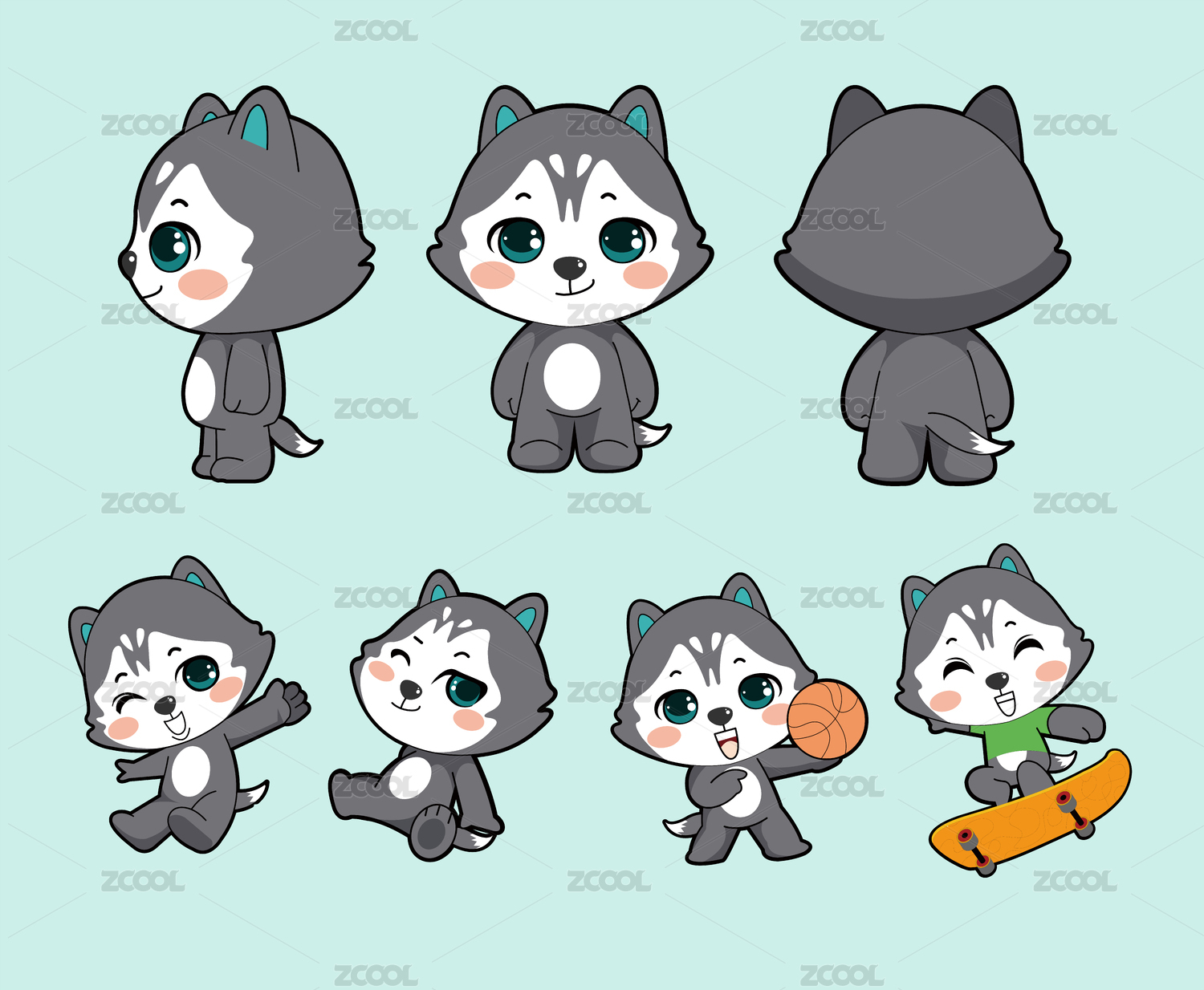 哈士奇卡通三視圖動(dòng)作延伸矢量圖
