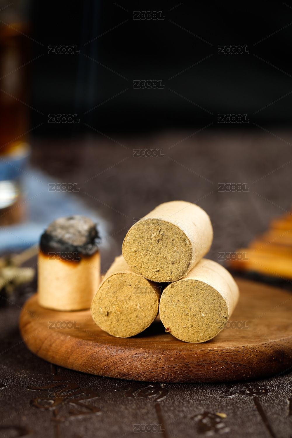 木墊上放著三個(gè)艾條和一個(gè)點(diǎn)燃的陳艾