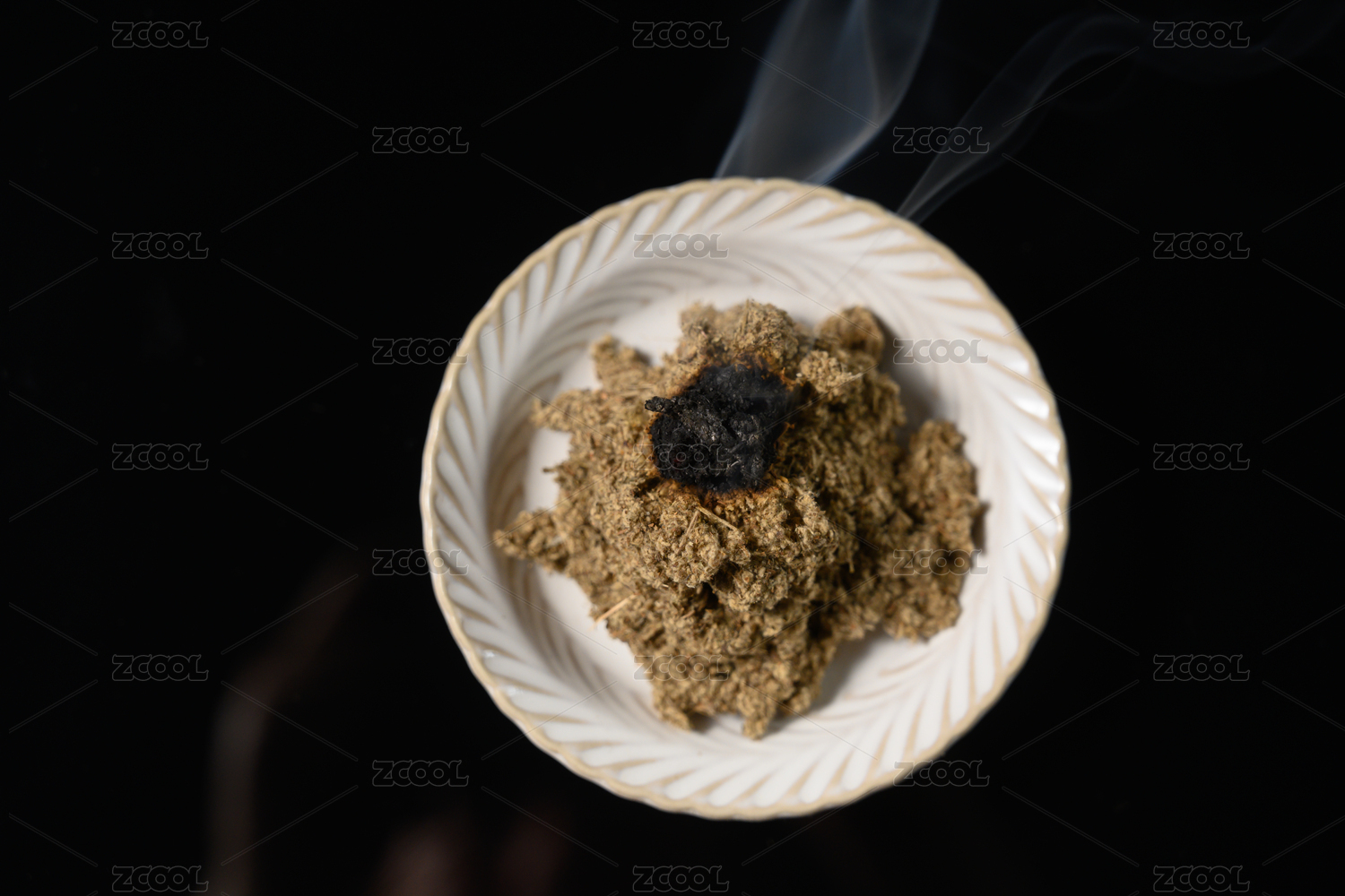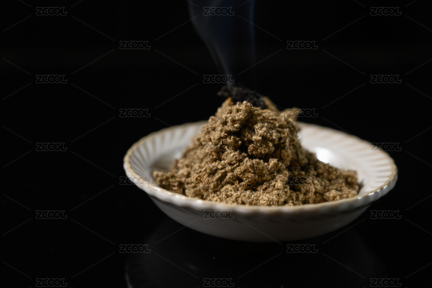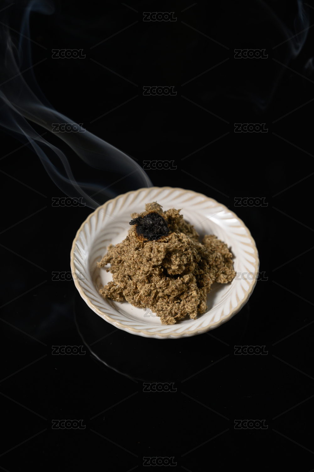 桌面上的盤(pán)子里點(diǎn)燃的艾草絨