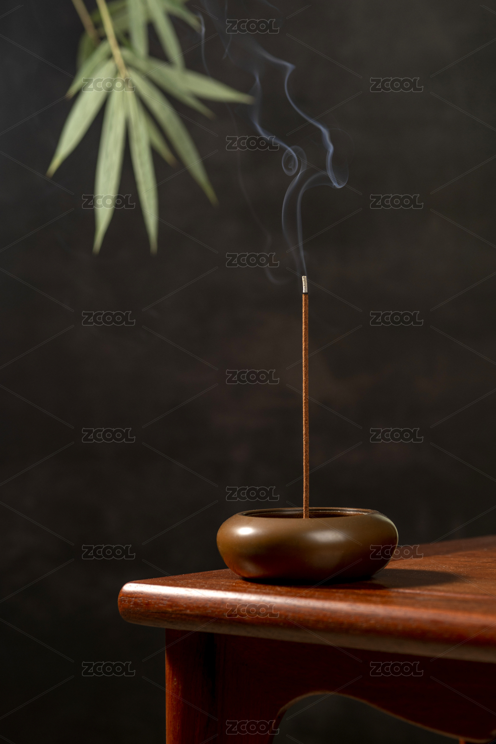 點(diǎn)燃的線(xiàn)香擺放在紅木茶幾上黑色背景