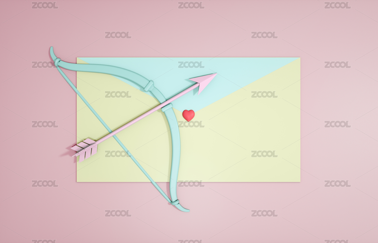 有著愛(ài)心裝飾的信封,簡(jiǎn)約柔色的背景,上面放著玩具弓箭