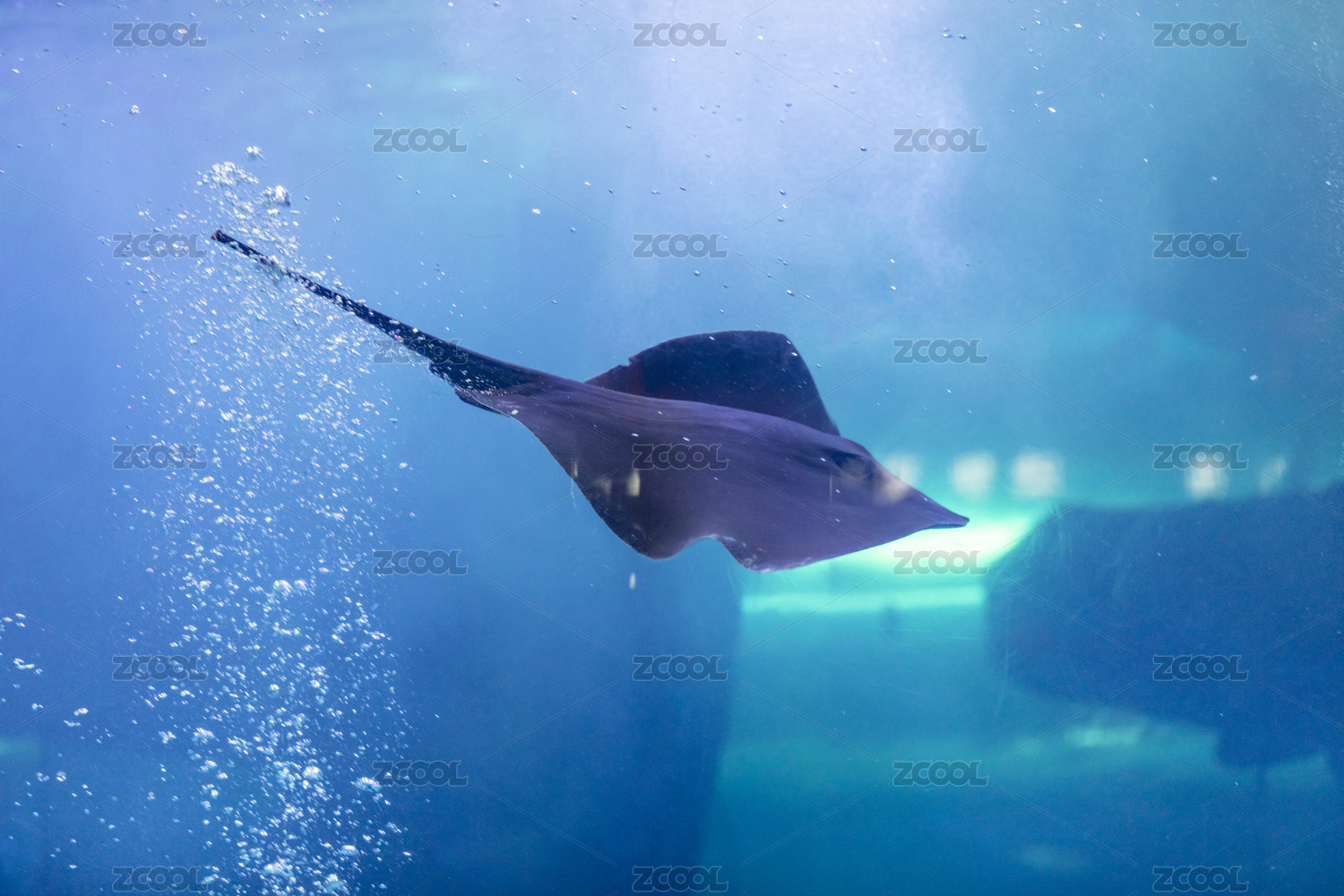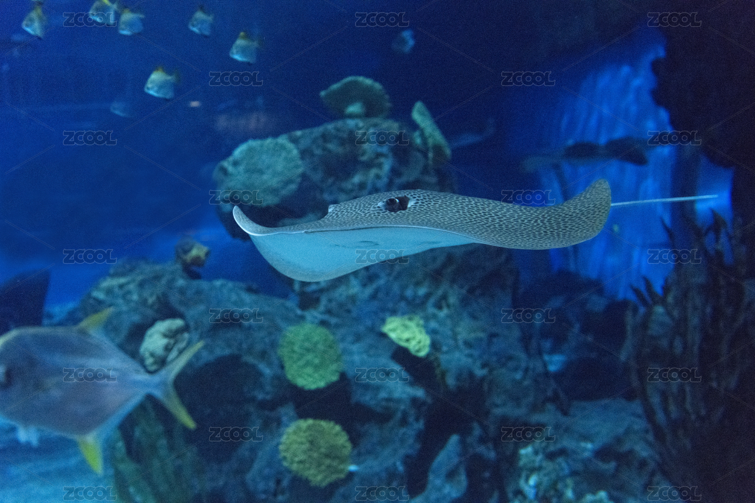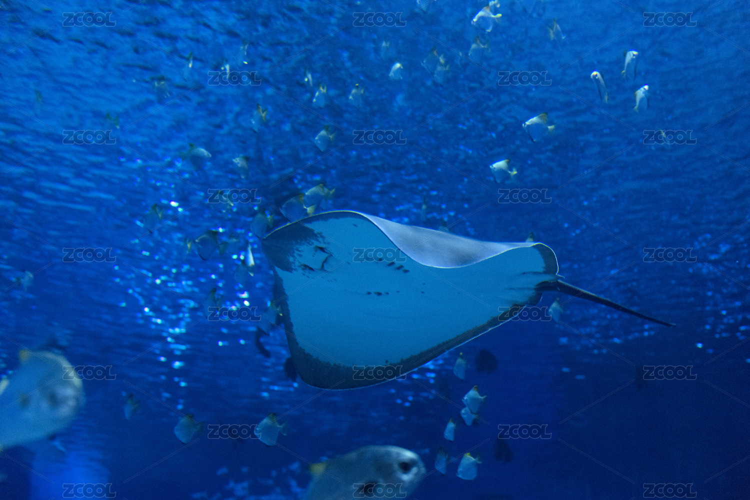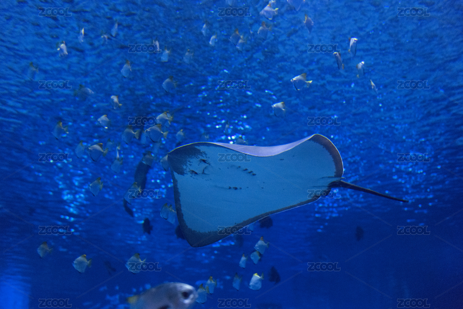 深藍色的大海中,一條鰩魚緩緩游過