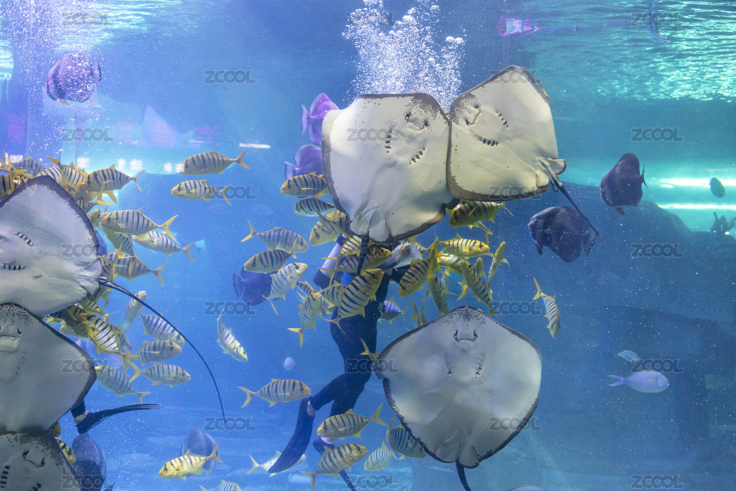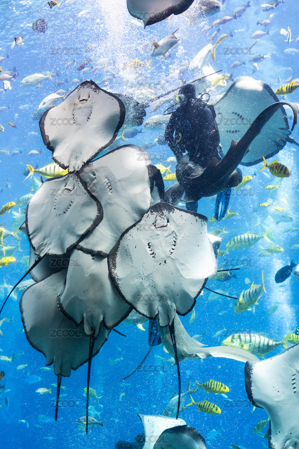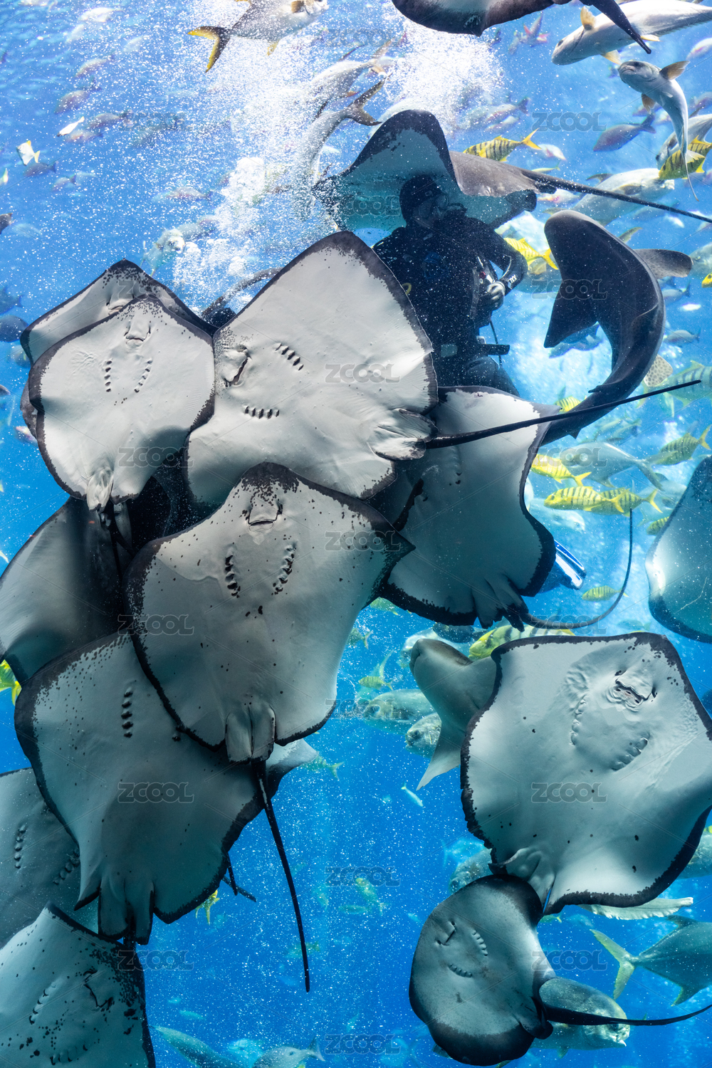 水族館中的潛水員在喂食鰩魚