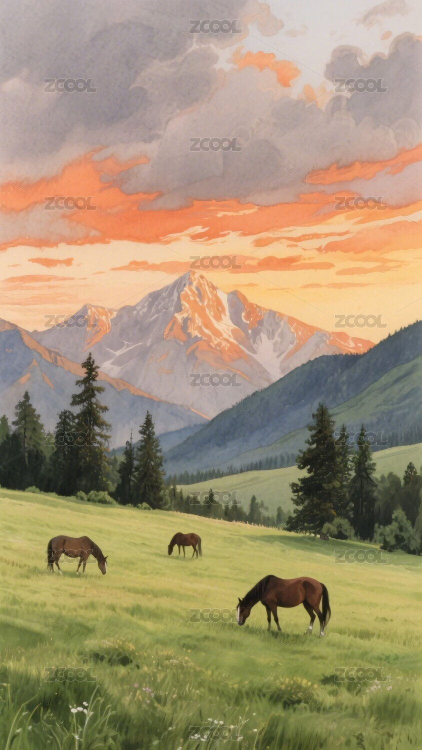草原上的馬匹與壯麗山景